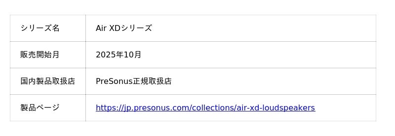 PreSonus ハードウェア部門 責任者のエイドリアン・ハーゼルフーバーは本シリーズについて「過酷なライブサウンド環境では、スピーカーの性能がすべてを左右します。新しい『Air XDシリーズ』は、そのクラスをはるかに超える音質、信頼性の高い接続性、そして直感的な操作性を実現しました。持ち運びや設置も容易で、パフォーマーに“優位性”をもたらすラウドスピーカーです」とコメントしています。