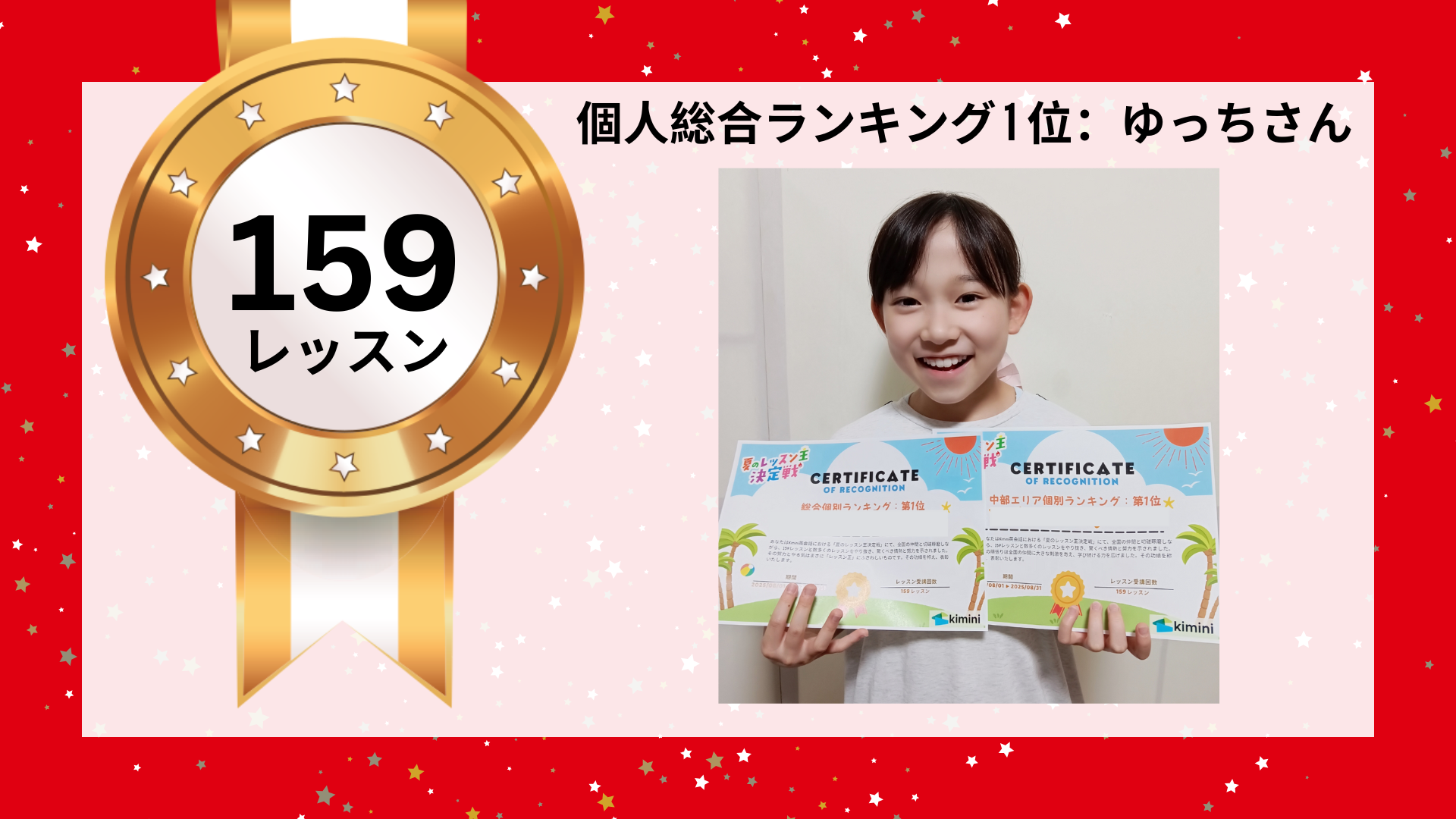 株式会社 学研ホールディングス(東京・品川/代表取締役社長:宮原博昭)のグループ会社で、オンライン英会話サービス「Kimini英会話」を提供している株式会社 Glats(東京・品川/代表取締役社長:杉原聡)は、2025年8月1日(金)から8月30日(土)の期間、全国のKimini英会話ユーザーを対象に、1か月間のレッスン受講回数を競うイベント「夏のレッスン王決定戦」を開催いたしました。