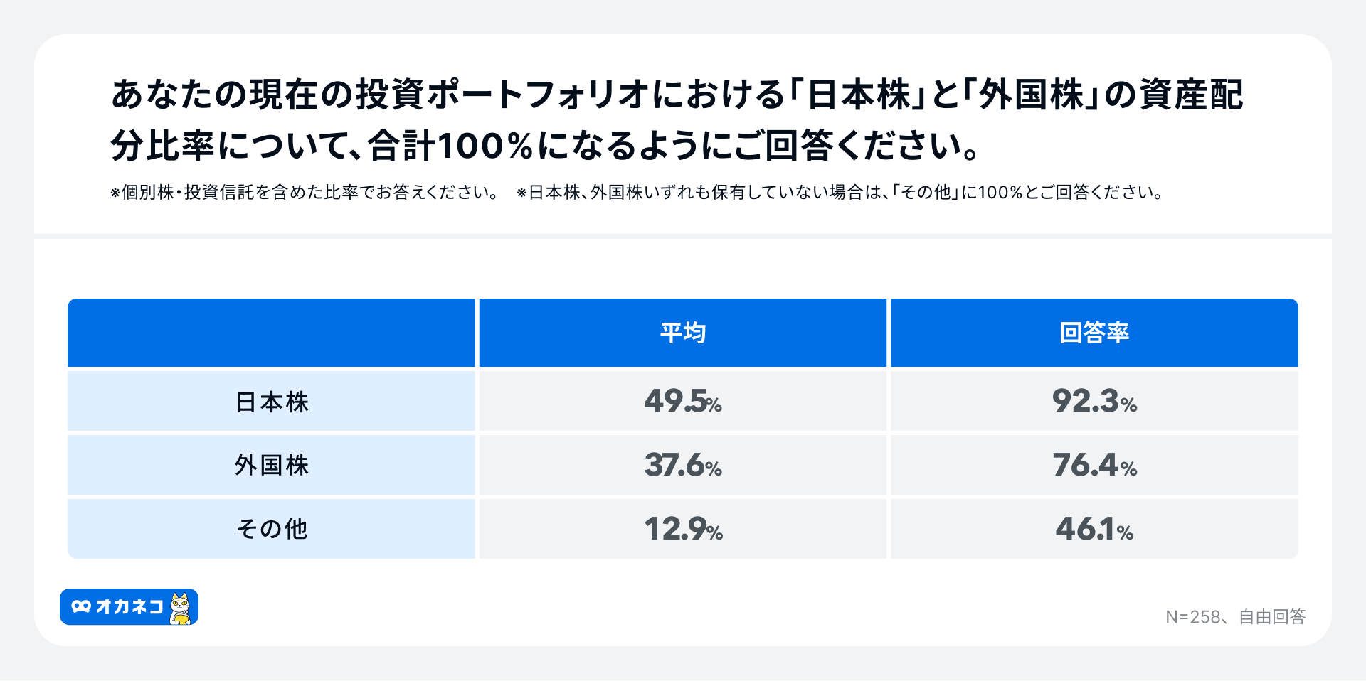 - 調査名:オカネコ 投資ポートフォリオに関する調査- 調査方法:WEBアンケート