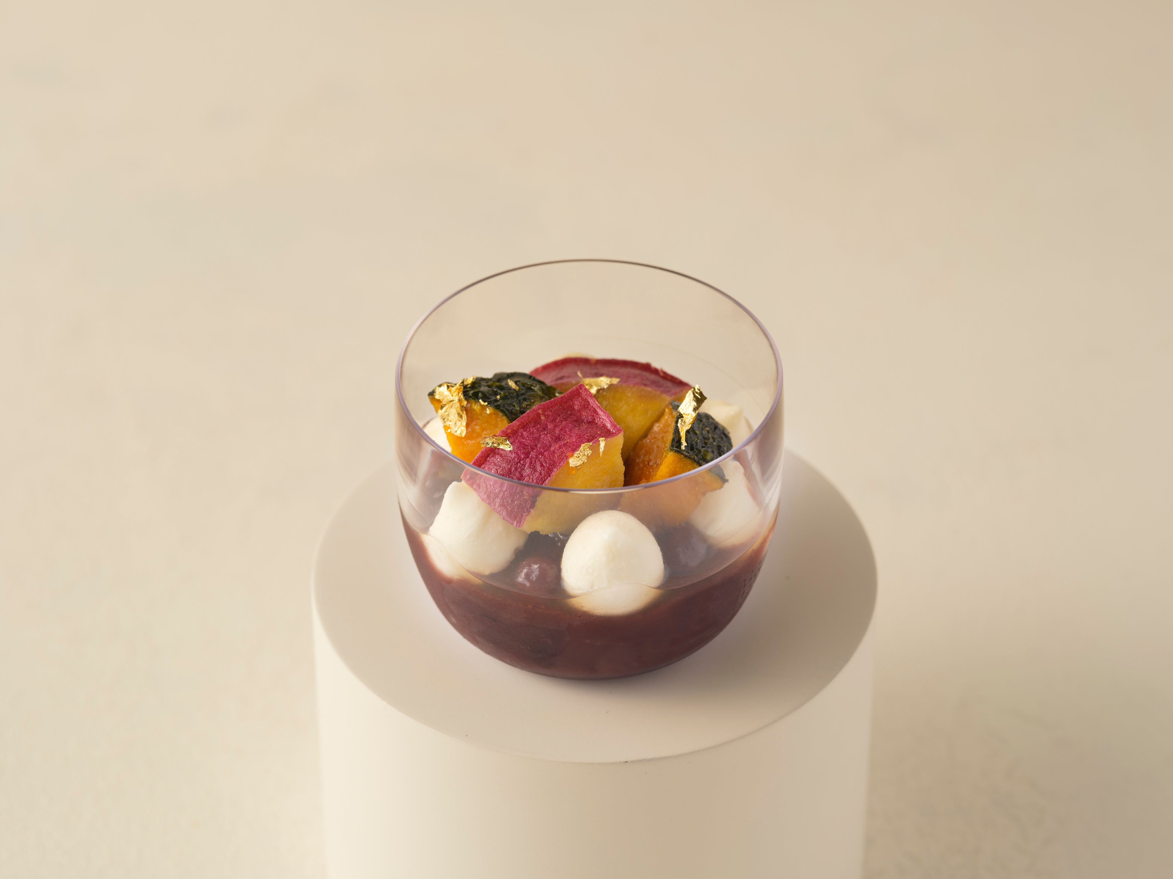 北海道十勝産特選小豆「雅」を使用し、ゆっくりと煮上げたぜんざいに、白玉餅とその上に小粒バターと大学芋風に仕上げたさつまいもとかぼちゃをのせました。