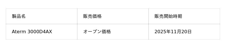 NECプラットフォームズは、Wi-Fi 6に対応した4ストリームのWi-Fiホームルータ「Aterm 3000D4AX」を2025年11月20日に発売します。