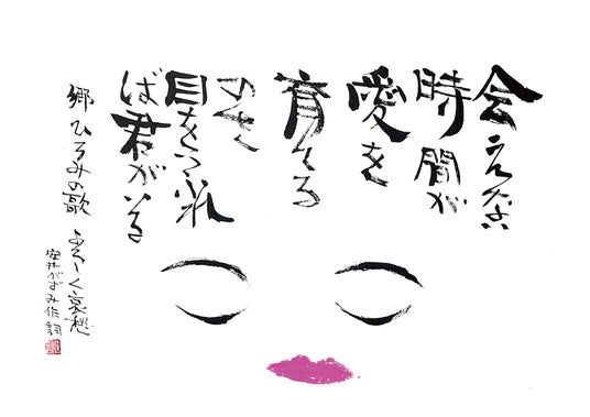 会場には「2億4千万の瞳」、「お嫁サンバ」をはじめとする数多くの名曲から歌詞を抽出した30点以上の作品を展示。美しい言葉のひとつひとつが、金田氏の奥深い墨の濃淡や巧みな筆使いによって一層の迫力を増し存在感を高めています。
