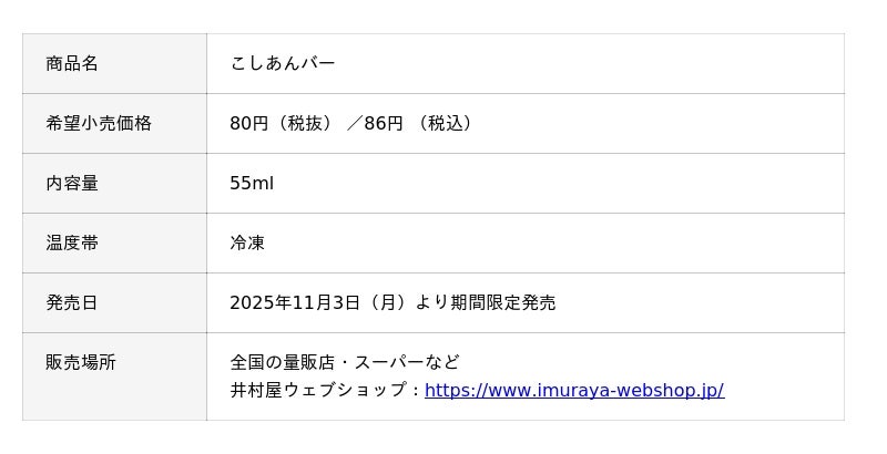 井村屋株式会社(本社:三重県津市高茶屋七丁目1番1号、社長:岩本 康)は、2023年8月に数量限定で発売し人気を博したアイスバー『こしあんバー』を、2025年11月3日(月)より期間限定で再販します。