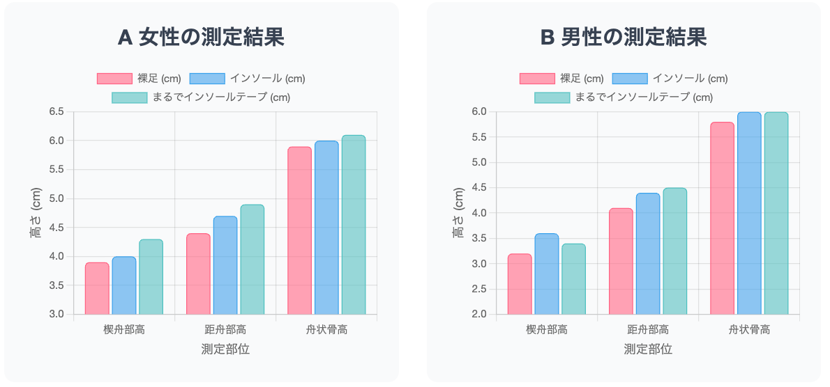 「まるでいんそーるテープ」の貼付効果は、医療用インソールと同等の内側縦アーチを保持する効果を有していることが示されています。特に女性被験者(30歳代)においては、医療用インソールよりもこれらの高さが上昇する結果が得られました。