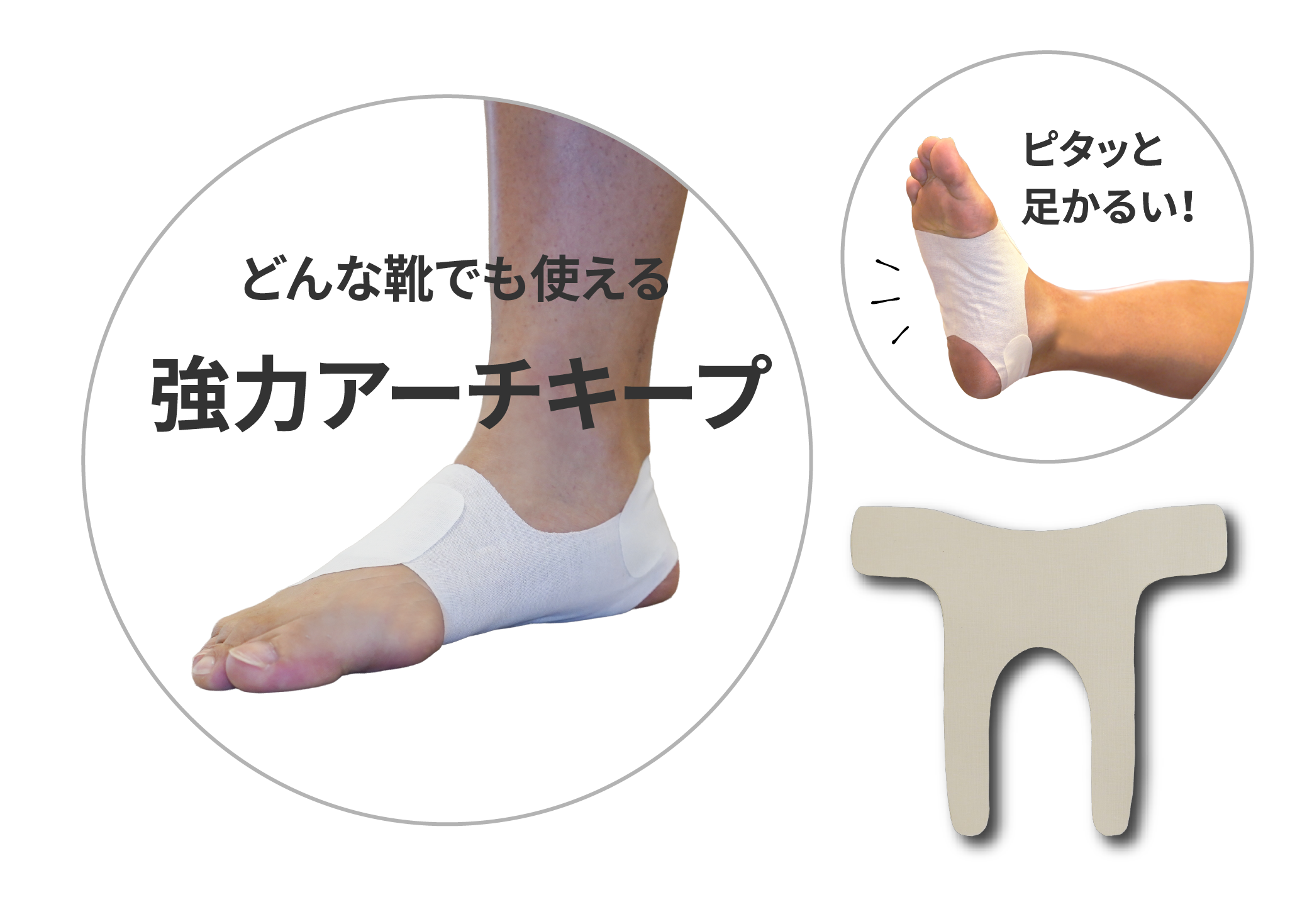 ・ 骨配列の強固な固定: 横パーツを足の甲に巻き付けて貼付することにより、中足部レベルでの横アーチの骨配列を保持します。これにより、足部の骨配列が正常化し、間接的に内側縦アーチの保持に作用させることができます。