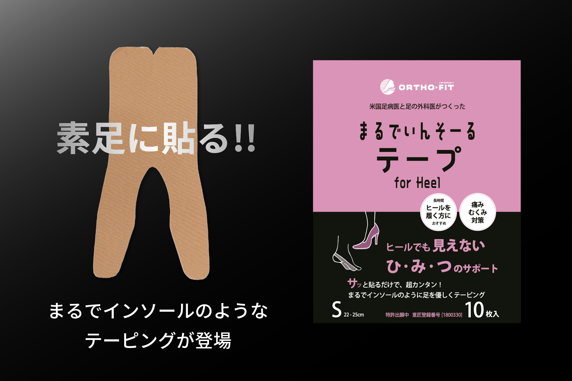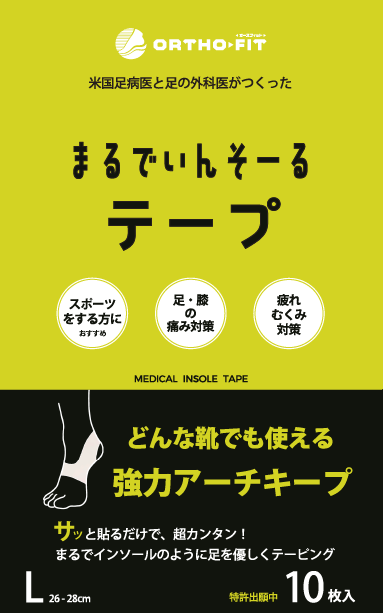 株式会社オースフィット(ORTHO-FIT SHOPを運営)は、医療機関向けに展開されてきた足裏サポート技術を応用し、一般消費者向けの画期的な新製品「まるでいんそーるテープ」を発売いたしました。本製品は、靴の形状やデザインを選ばずに直接足裏に貼ることで、まるでインソールのような快適なサポートを実現する、特許申請中(意匠登録済み:登録意匠第1808793号)の足用テーピングです。