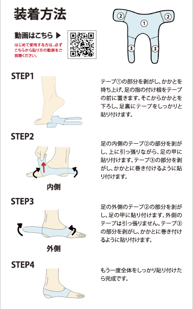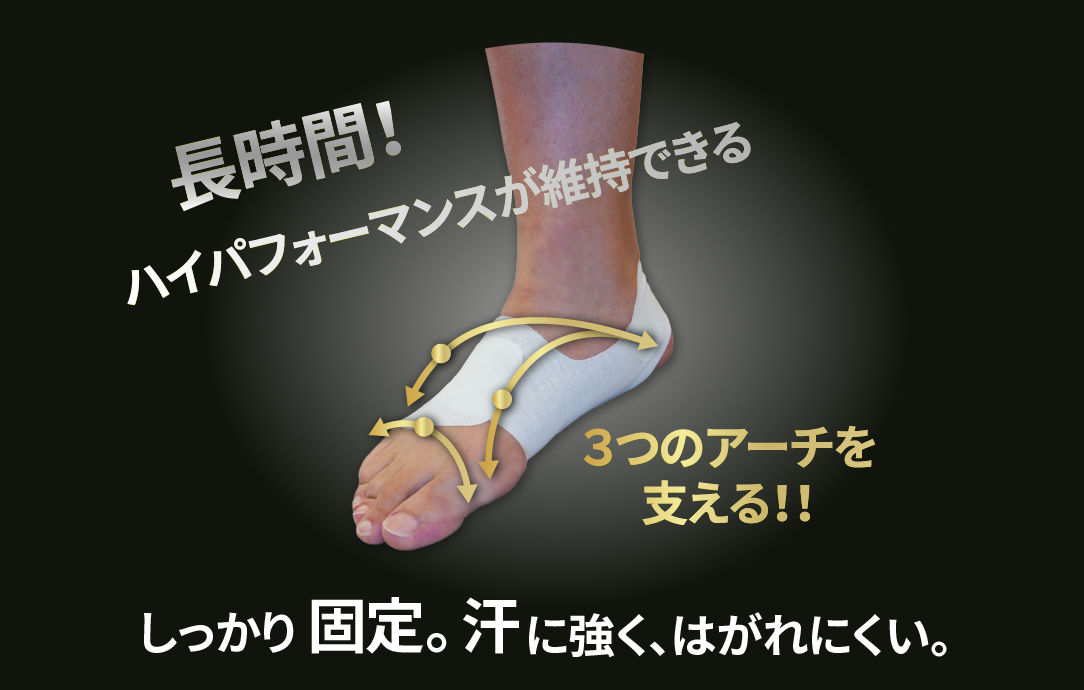 ・ 牽引力による持続効果: ヒール部(縦パーツ)を踵骨の後ろ側に巻き付けて貼り付け、横パーツを後方に牽引することで、内側縦アーチを構成する骨(中足骨、楔状骨、舟状骨)を踵骨側に引き付けます。これにより、足が強固に固定されるため、衝撃が生じる運動を行っても保持効果を持続できます。