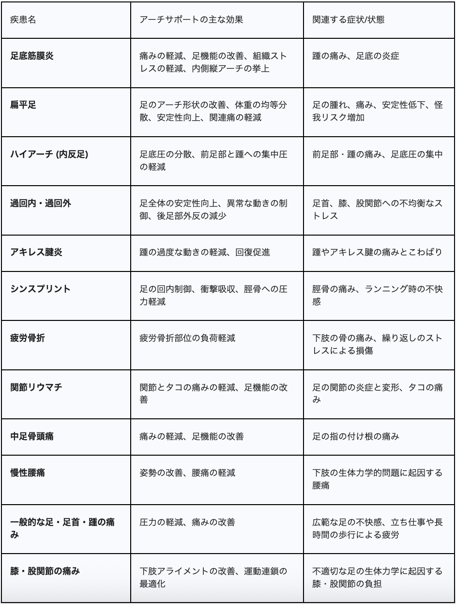 表1:アーチサポートが治療に用いられる主な疾患と効果の概要