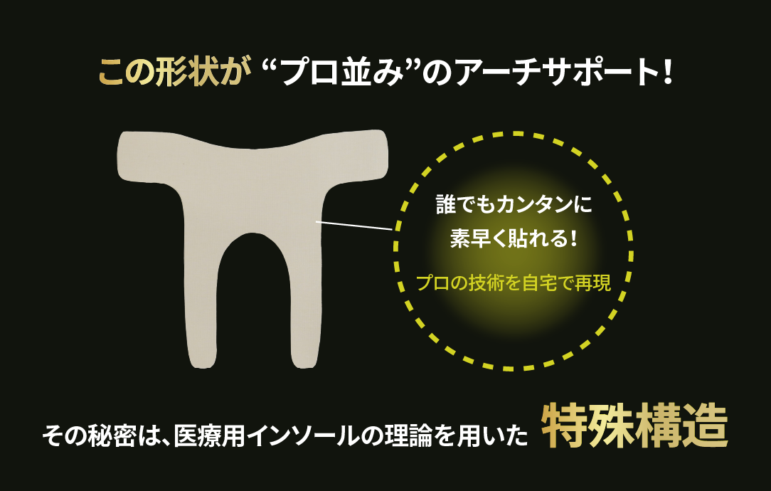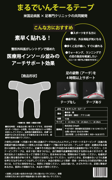 本商品は「まるでいんそーる」という商品名のとおり、フットオーソティクスが有するアーチサポート機能をテーピング技術により提供する画期的な商品になります。