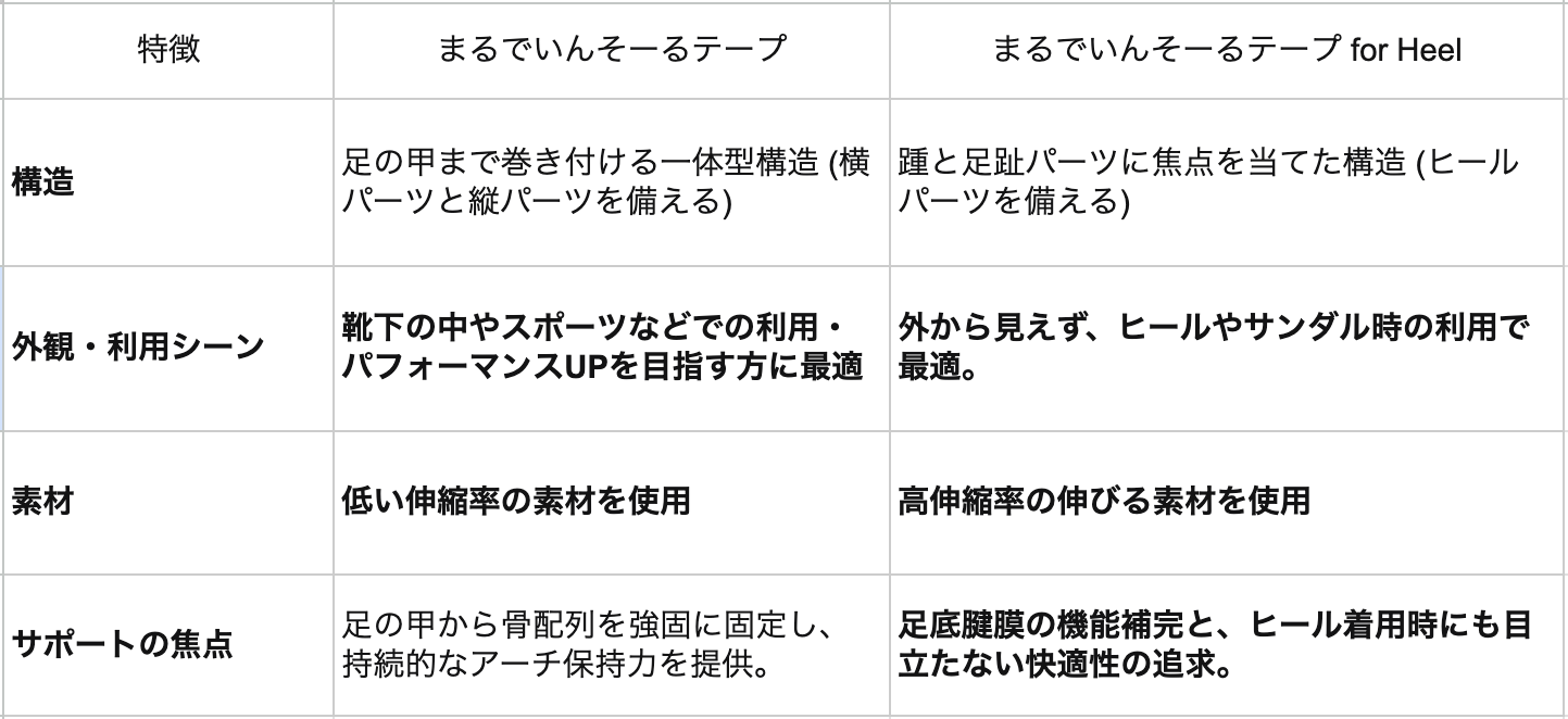 当社が先行販売している「まるでいんそーるテープ for Heel」と、今回発売する「まるでインソールテープ」は、それぞれ異なるサポートニーズに対応しています。