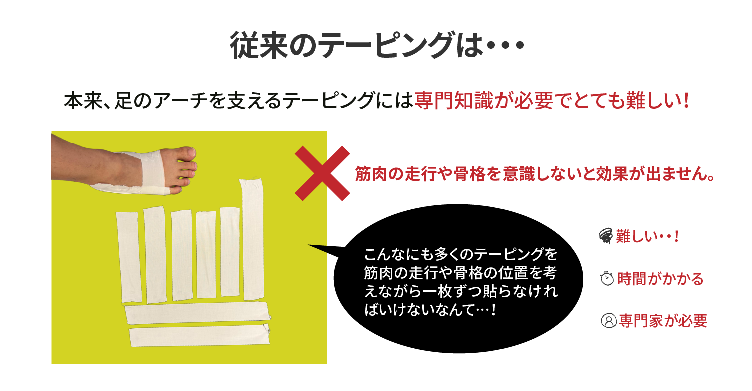 - テーピング:専門の技能を持つ医師や理学療法士が、所定の手順と引っ張り力で帯状のテープ材を巻き付ける必要があり、作業が複雑で特別な技能が必要とされていました。