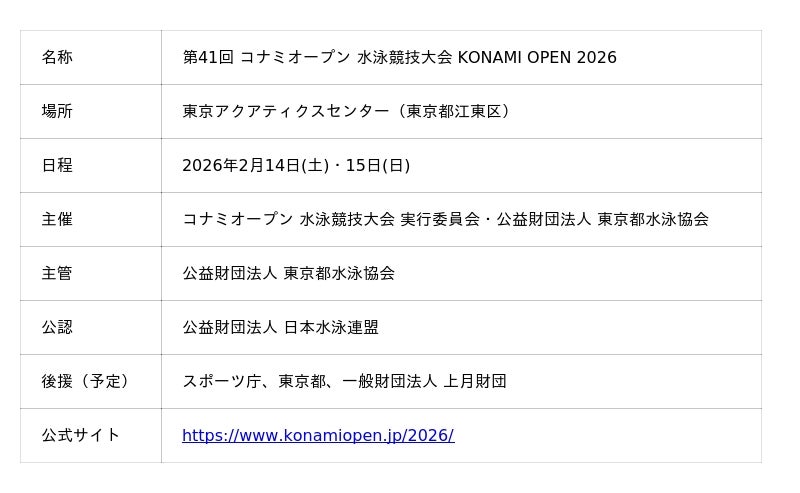 コナミオープン 水泳競技大会 実行委員会は、2026年2月14日(土)・15日(日)の2日間、東京アクアティクスセンター(東京都江東区)で「第41回 コナミオープン 水泳競技大会」を開催します。