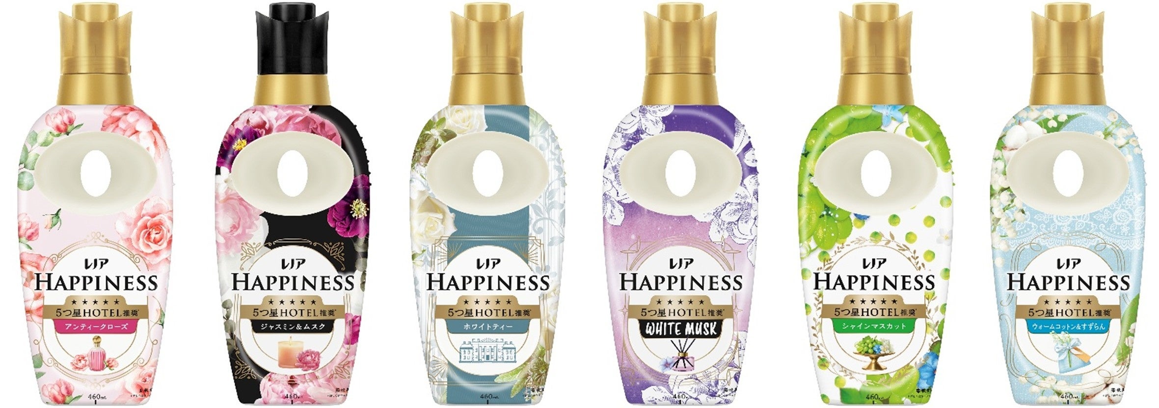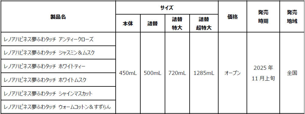左から:「レノアハピネス夢ふわタッチ アンティークローズ」、「レノアハピネス夢ふわタッチ ジャスミン&ムスク」、「レノアハピネス夢ふわタッチ ホワイトティー」、「レノアハピネス夢ふわタッチ ホワイトムスク」、「レノアハピネス夢ふわタッチ シャインマスカット」、「レノアハピネス夢ふわタッチ ウォームコットン&すずらん」
