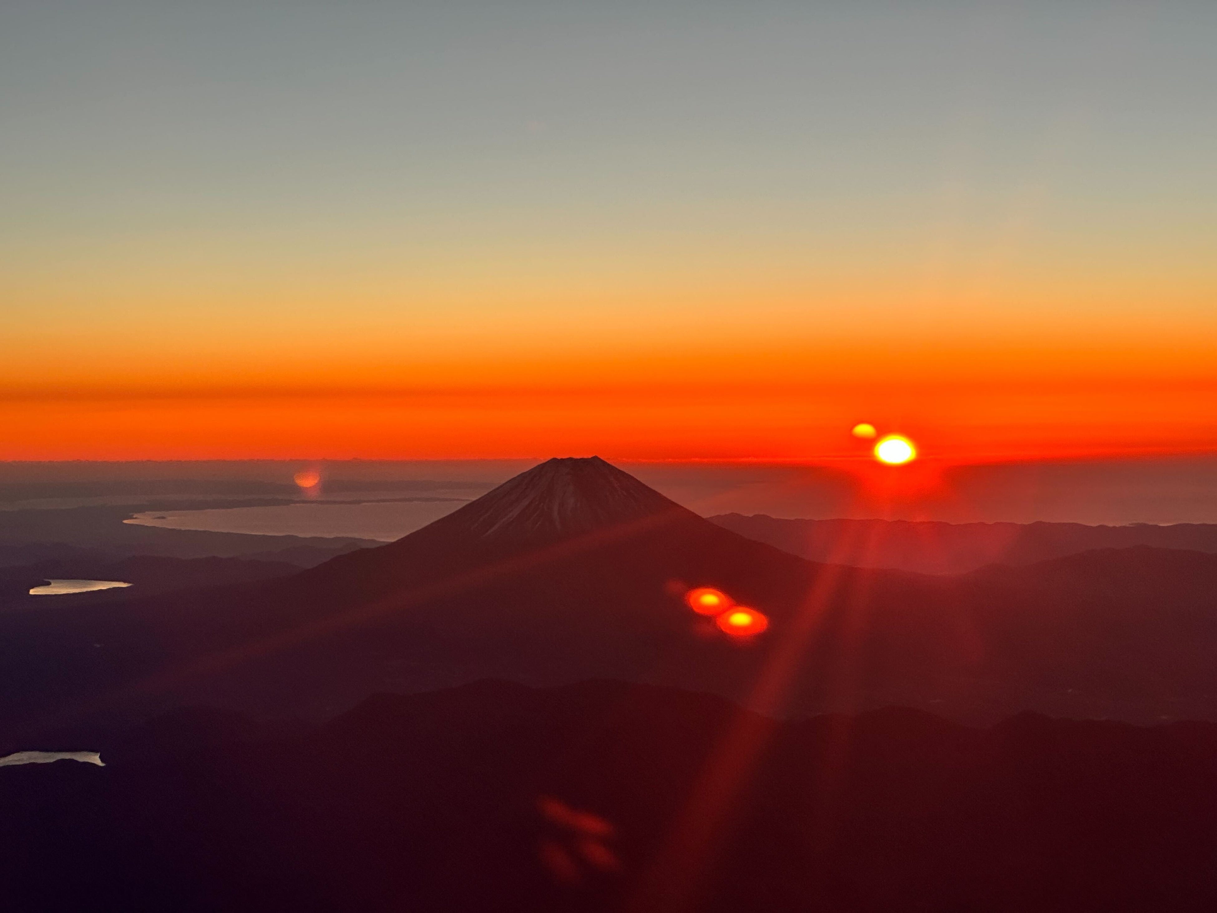 2.富士山の西北西約35kmの地点(南アルプス赤石岳付近)、高度17,000ft (約5,182m) で初日の出を鑑賞。