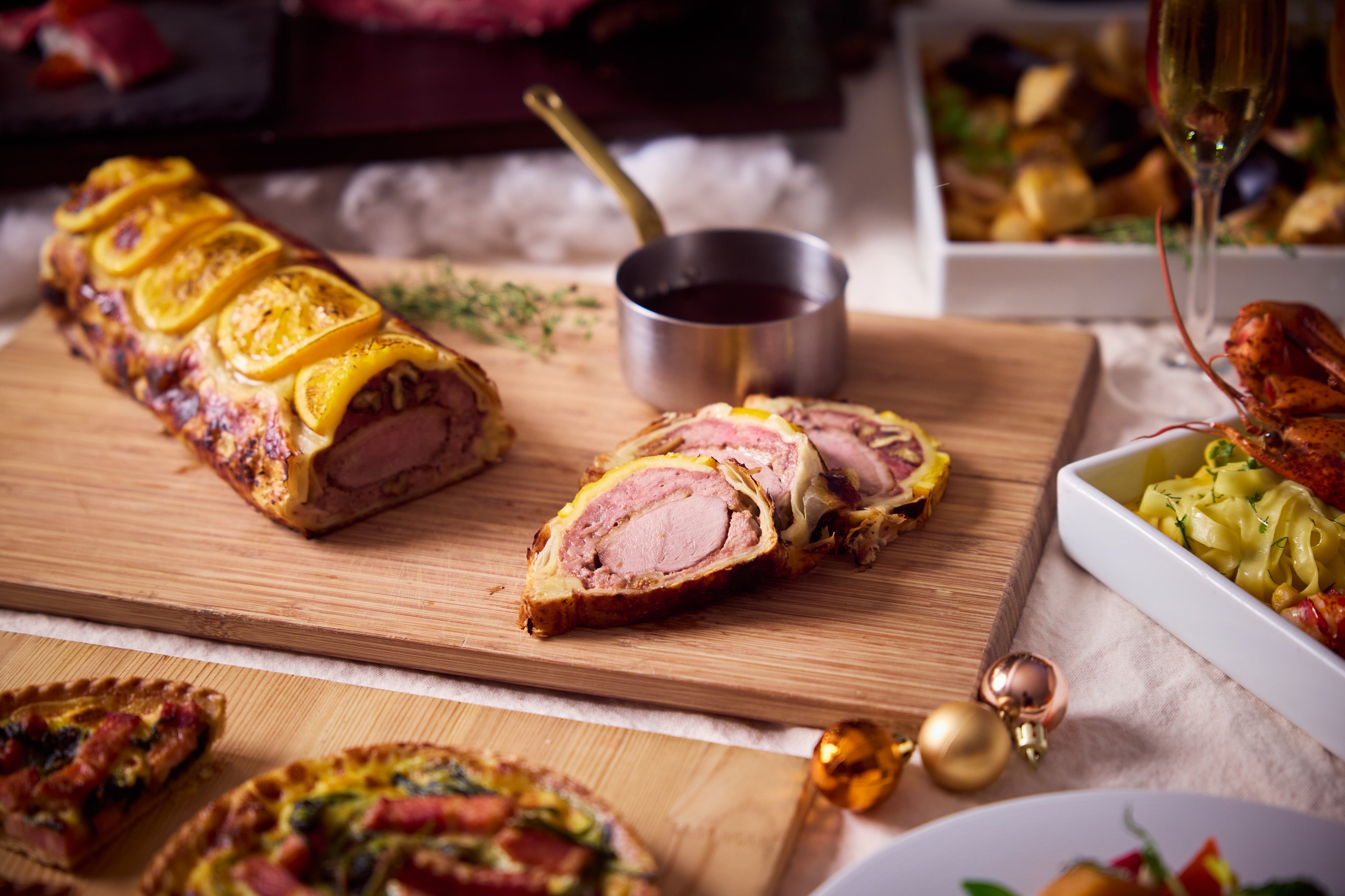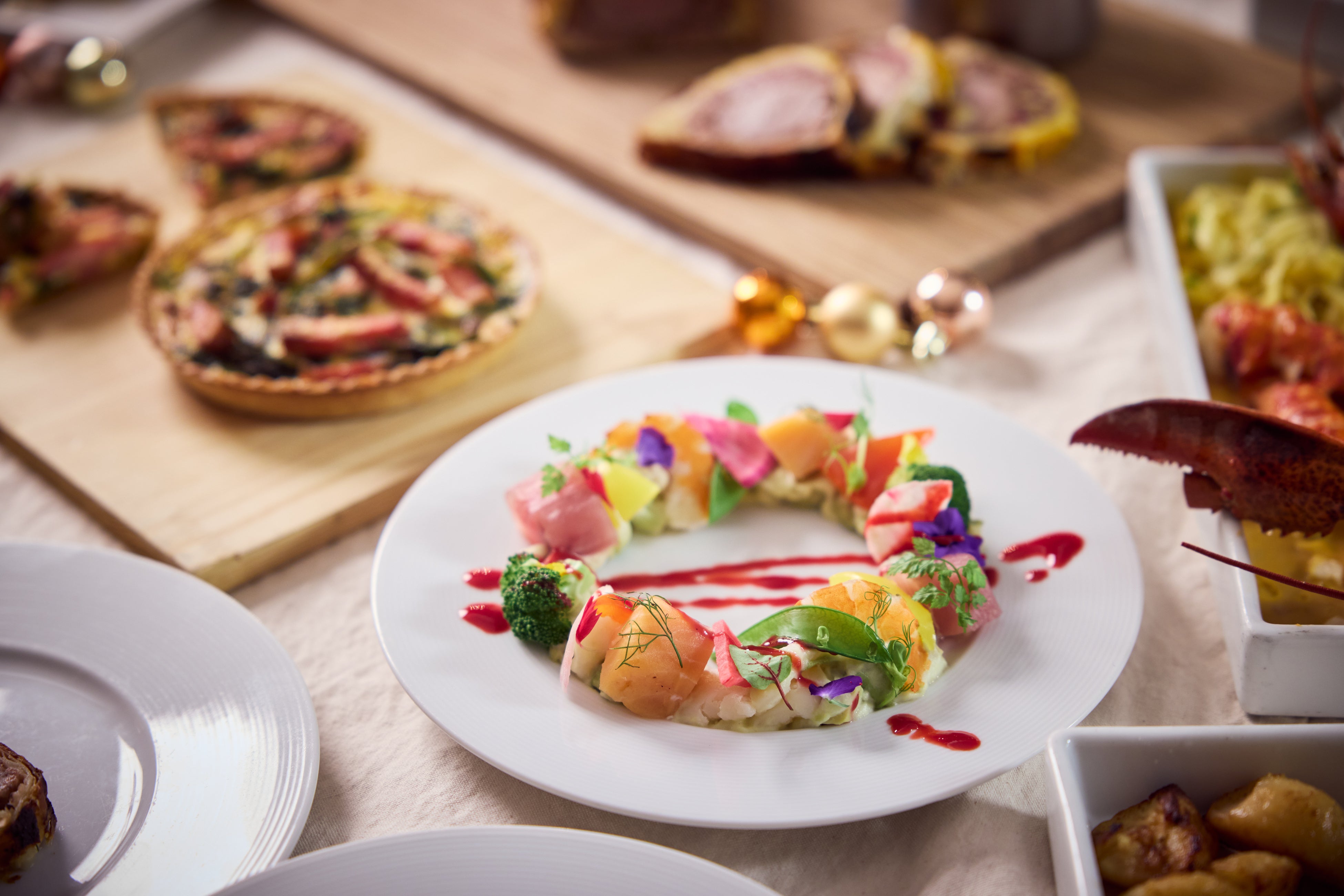 クリスマスにふさわしい華やかな料理がビュッフェ台に並びます。