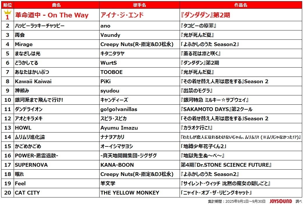 話題作の放送開始にあわせて主題歌が大きな支持を集めた今夏、『ダンダダン』第2期のオープニングテーマ、アイナ・ジ・エンド「革命道中 - On The Way」が堂々の1位を獲得!オカルト×青春という作品の世界観に寄り添った幻想的なメロディがリスナーを魅了し、エンディング・テーマのWurtS「どうかしてる」も6位にランクインしました。また、全6話ながら大きな話題となった『タコピーの原罪』も健闘し、オープニングのano「ハッピーラッキーチャッピー」が2位にランクイン。“救いを求める声”を歌詞に込めたダークポップ×エモロックな一曲として注目を集めました。