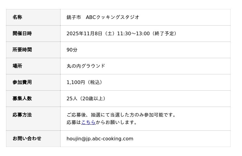 株式会社飯田商店(本社:千葉県銚子市 代表取締役社長:飯田安敏)は、2025年11月8日(土)に丸の内グラウンドで開催される「銚子市 × ABCクッキングスタジオ 連携イベント」に協賛・出展いたします
