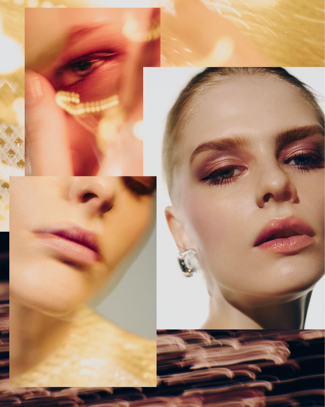 煌びやかなグリッターやメタリック、滑らかなサテン、光をチューニングするセミマット、4種のアイカラーに、ひとはけでソフトなヴェールを仕込む“光らない”ブライトニングパウダーをセット。