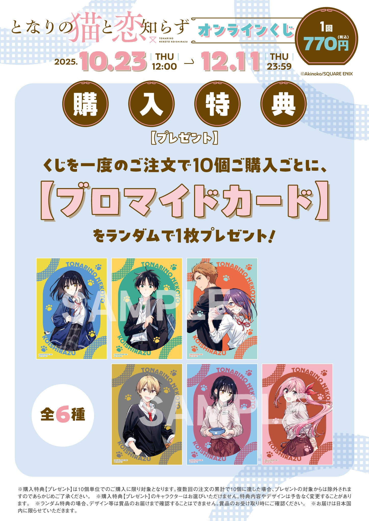 本日2025年10月23日正午より、スクウェア・エニックス e-STORE、DMMスクラッチにて『となりの猫と恋知らず』(あきのこ先生)のオンラインくじの予約受付が開始いたしました。