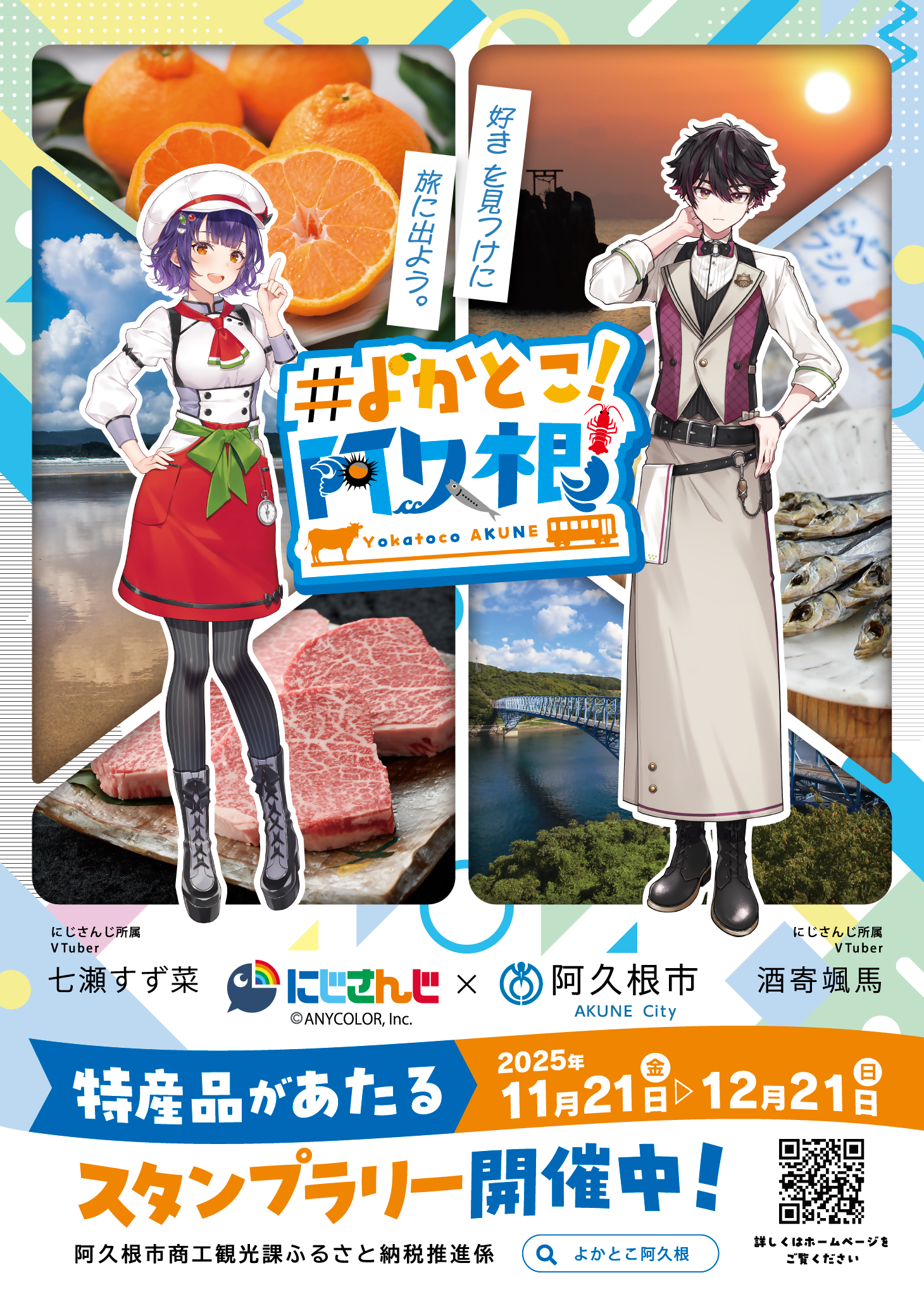 そこで、幅広い世代から絶大な人気を誇るVTuber・バーチャルライバーが数多く在籍する「にじさんじ」とコラボし、ライブ配信や観光地周遊スタンプラリーを実施し、阿久根市の魅力を全力で発信します!