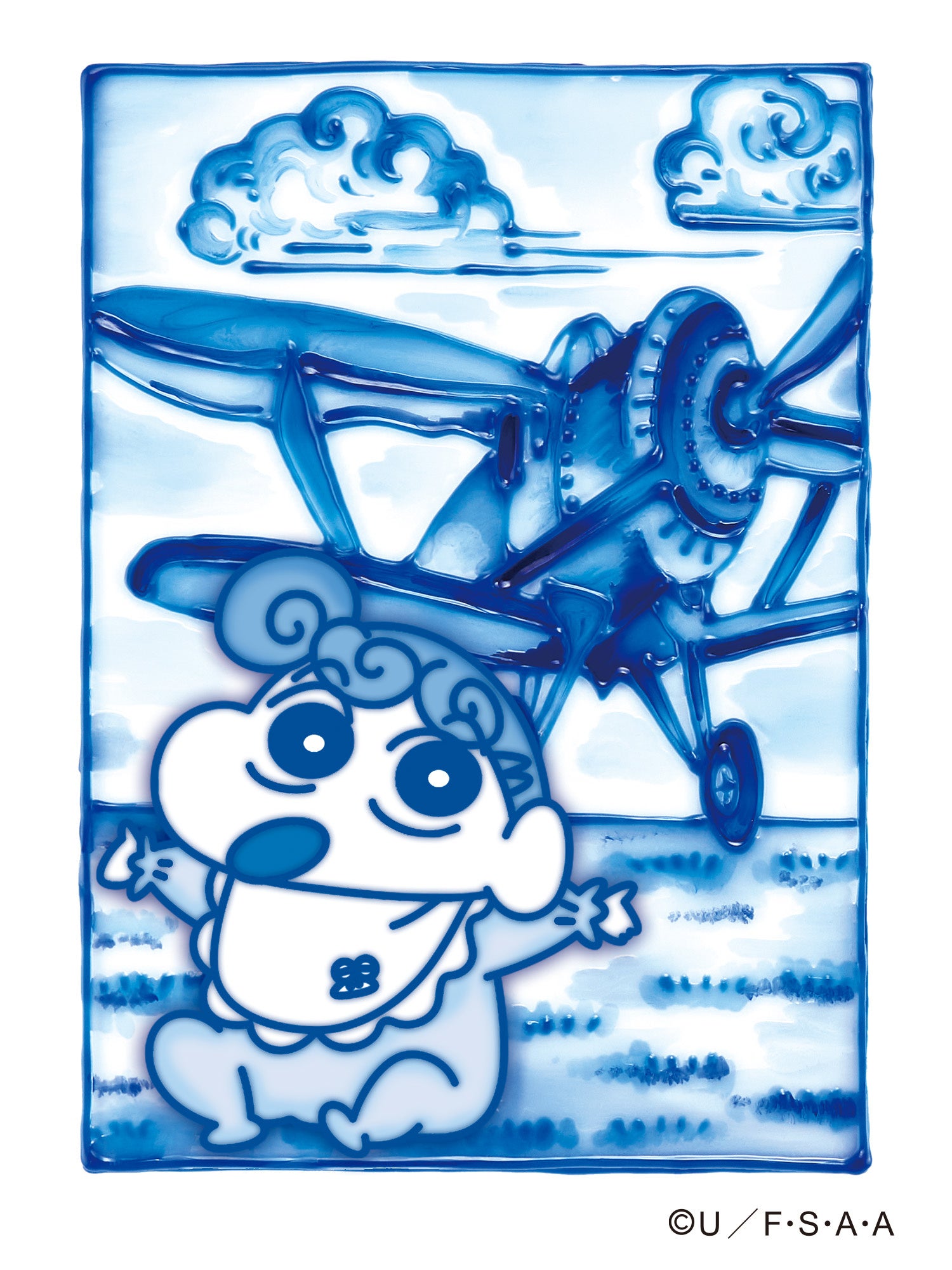飛行機の操縦を任されたのは…?しんちゃんたちの空の旅をヨーロッパ風タイルデザインで表現