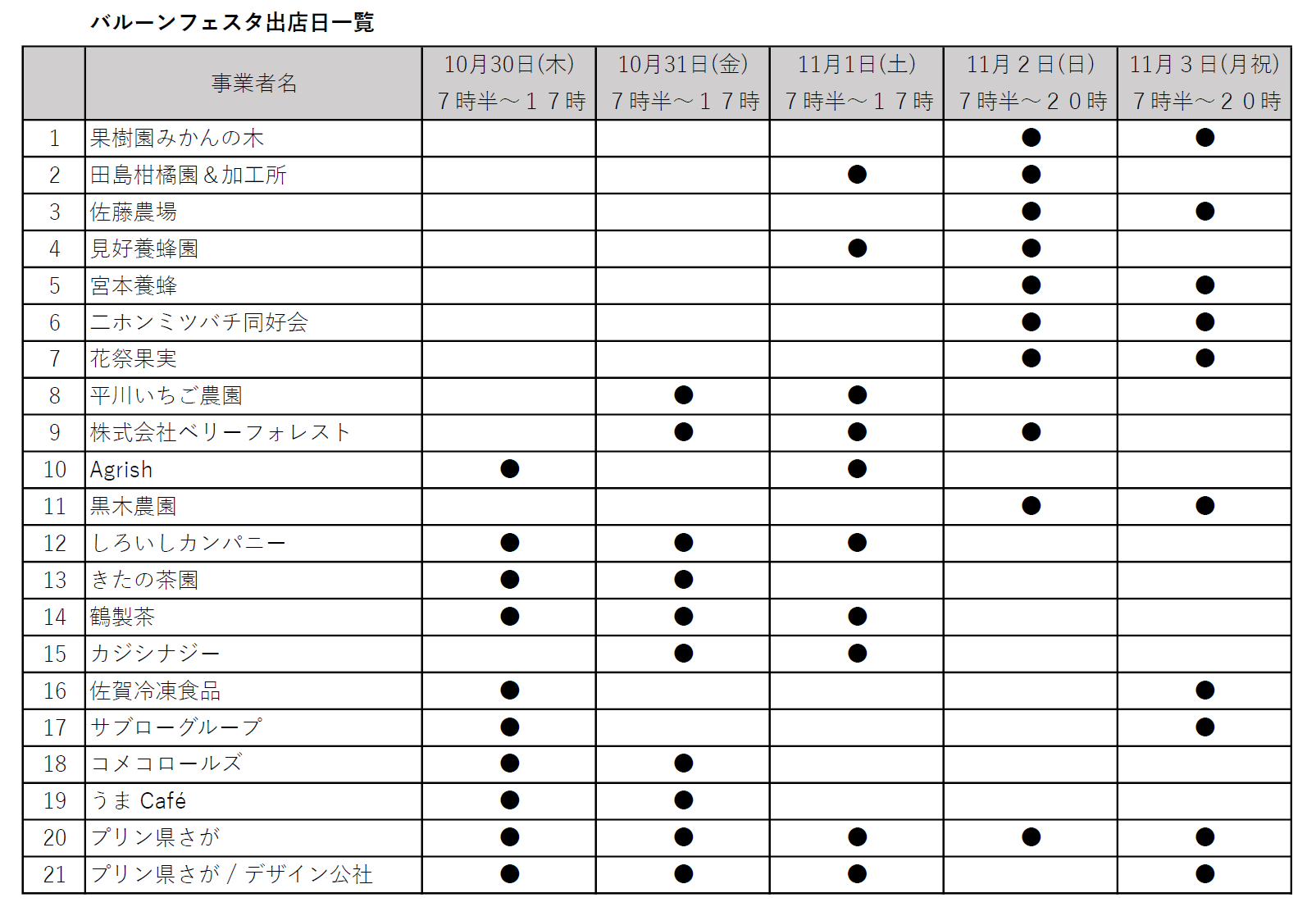 2025佐賀インターナショナルバルーンフェスタ「うまかもん市場」出店について1.日程:令和7年10月30日(木)~11月3日(月・祝)