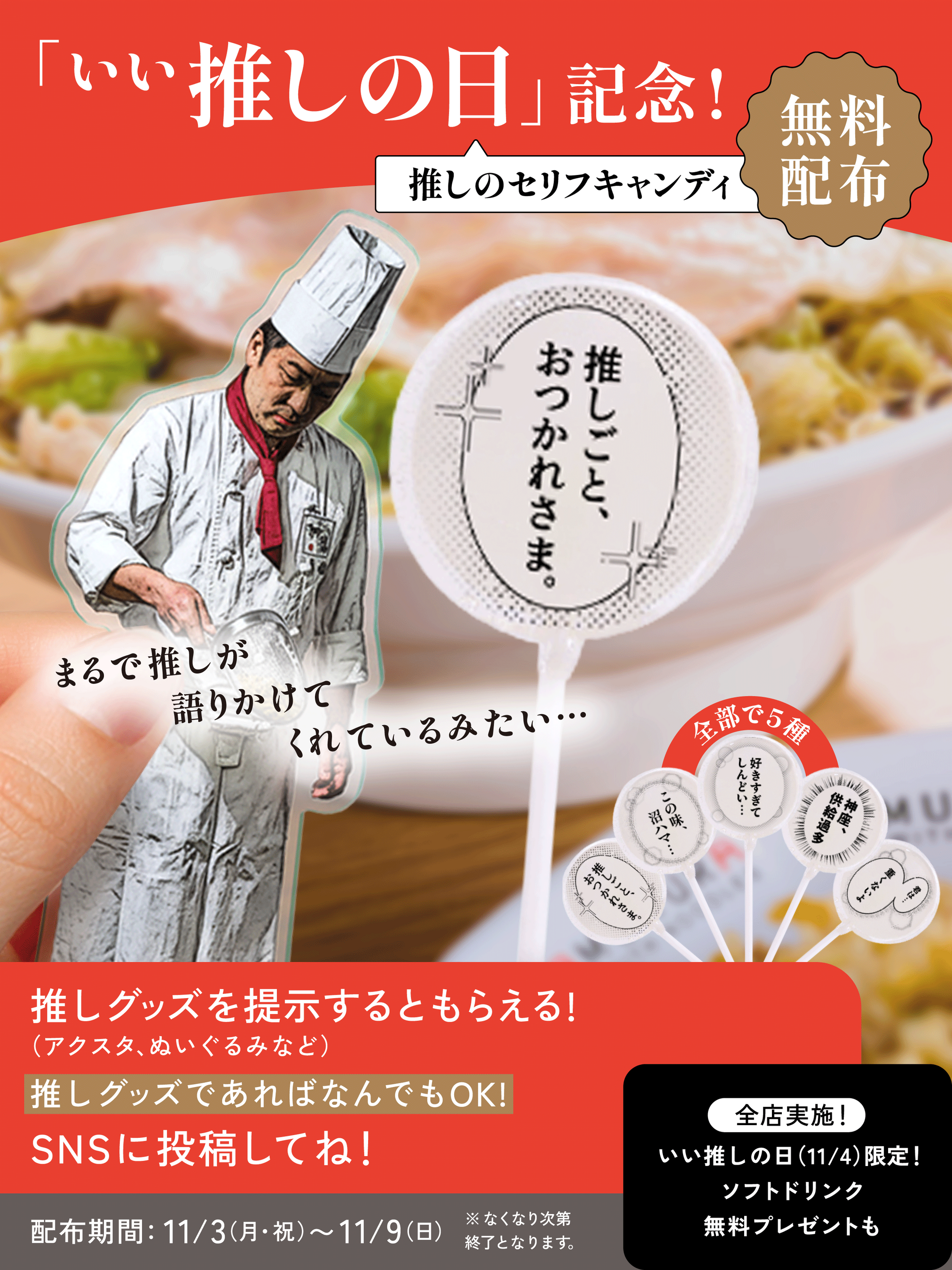 ご注文時、商品提供時等に推し活グッズをご提示いただいた方に、11月4日(火)限定で皆様の推しへのサービスとしてソフトドリンク一杯をプレゼントいたします。さらに、11月3日(月)から11月9日(日)にはグッズをご提示いただいた方に先着順で推しグッズと写真を撮って楽しめる神座特製の漫画風プリントデザインキャンディをプレゼントいたします。