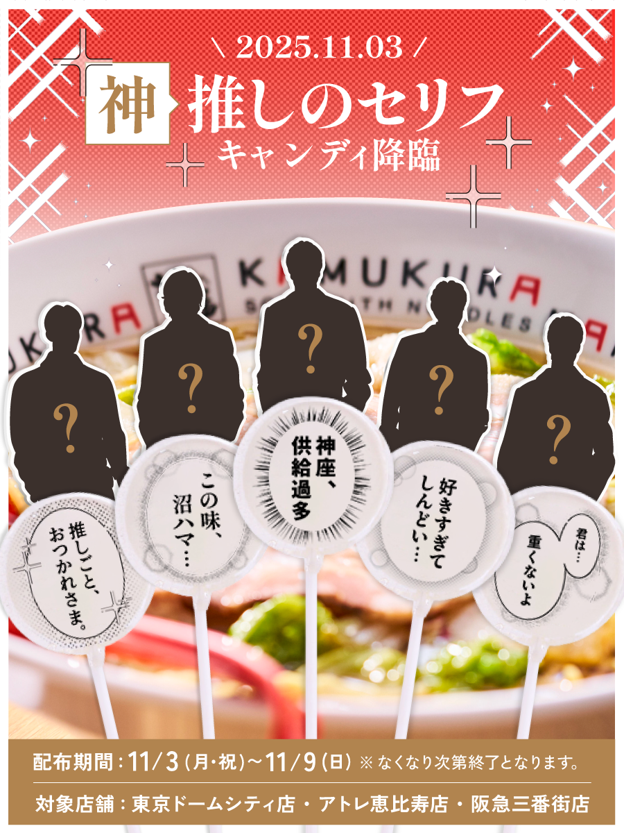 11月3日(月)から11月9日(日)には、一部店舗にて推し活グッズをご提示いただいた方に先着順で神座特製の漫画風プリントデザインキャンディ「推しのセリフキャンディ」をプレゼントいたします。