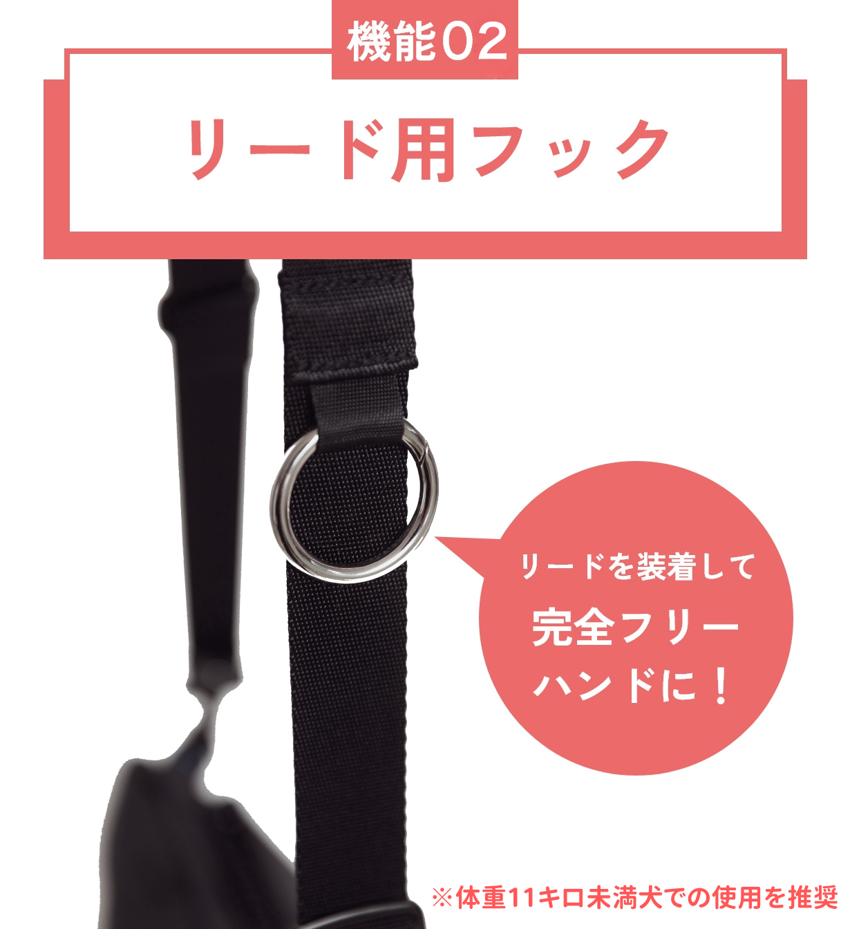 02:リード用フックショルダー部分のリード用リングフックを使用すれば、両手をフリーにしてお散歩ができます。