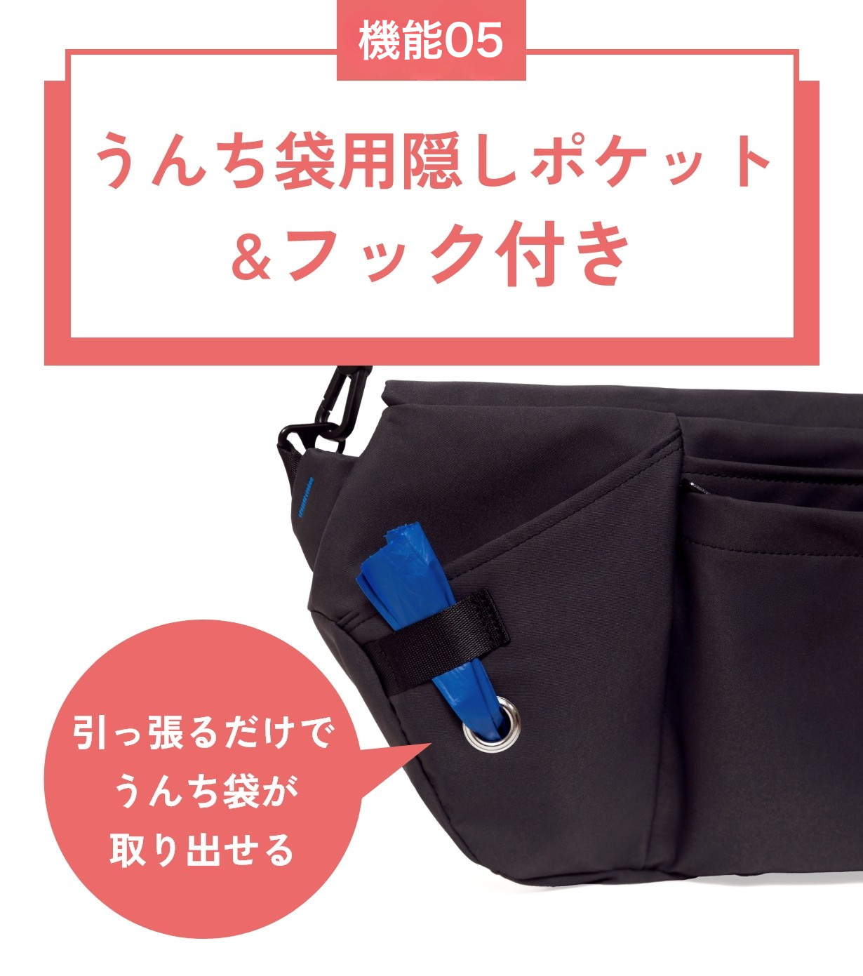 05:うんち袋用隠しポケット &フック付き隠しポケットにうんち袋をセットしておけば、引っ張るだけですぐにうんち処理の準備ができます。