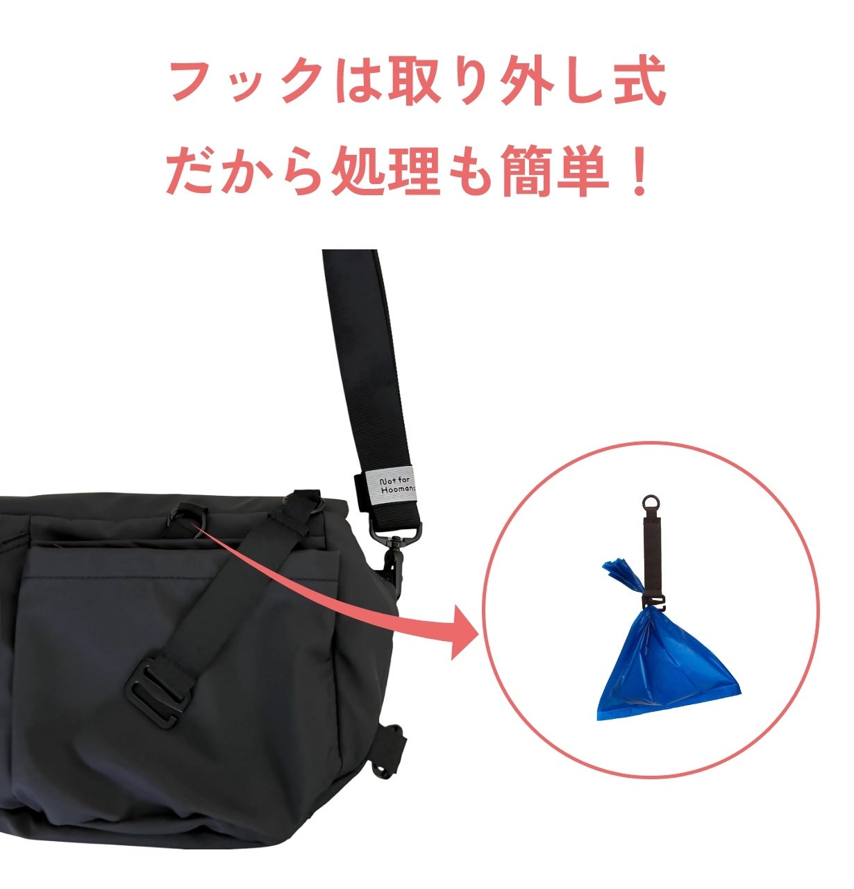 また、お散歩にはうんち処理がつきのもの。臭いの気になるものをバッグにしまうのは躊躇してしまいます。そこで、DogGo Bagはうんち袋専用フックを搭載しました。