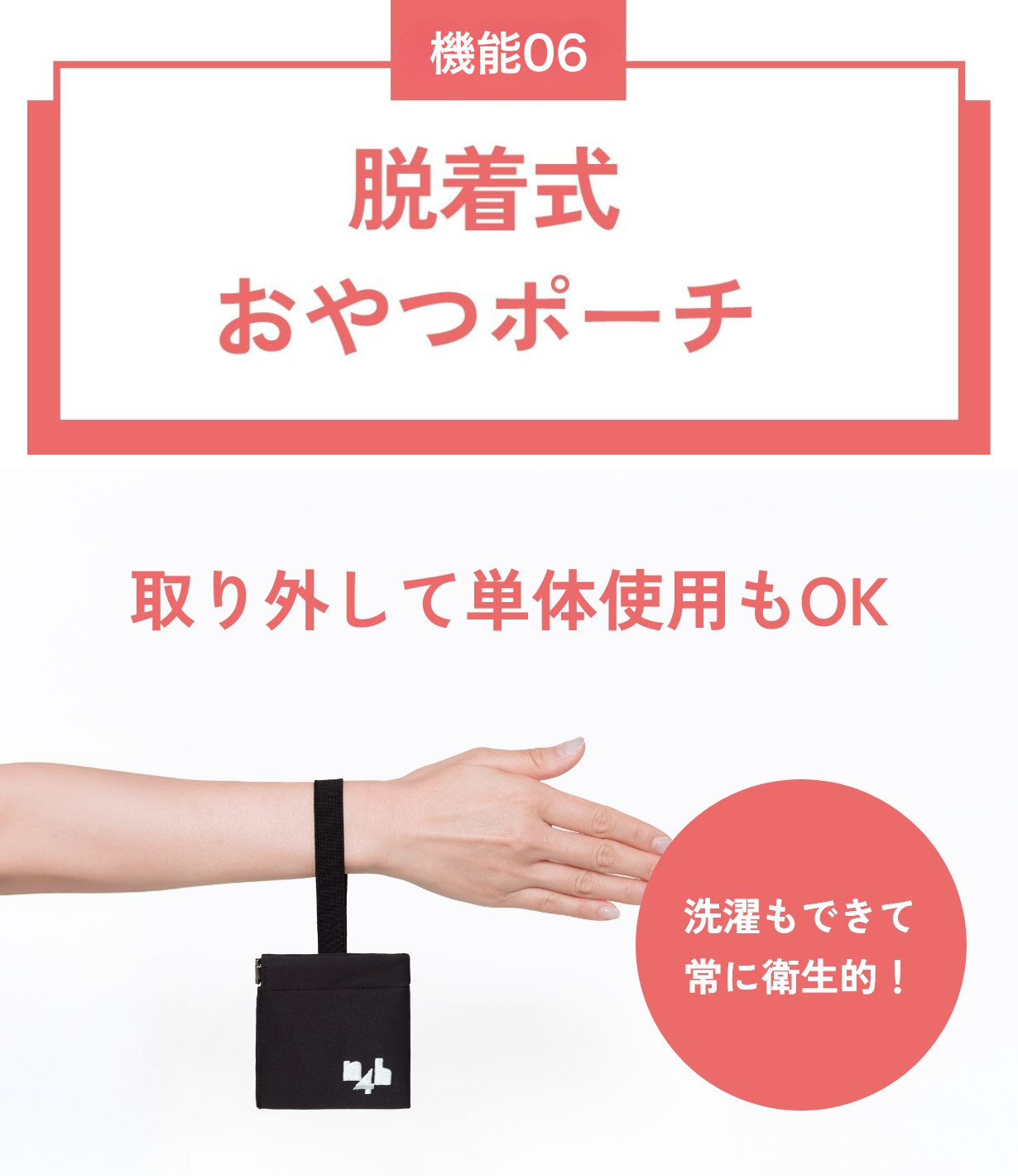 06:脱着式おやつポーチおやつポーチが、うんち袋専用フックと同じく外付けになっており、バッグの中を汚さずにおやつを持ち歩きできます。