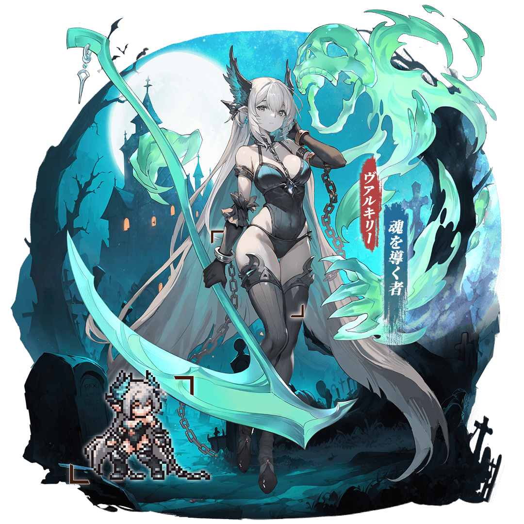 主人公ヴァルキリーのもう一つのハロウィン装いは、死神の鎌を携えた「魂を導く者」。冥府の王を思わせる漆黒の装甲と、大きくたなびくゴーストの影が、彼女の周囲に威圧的な力を漂わせます。