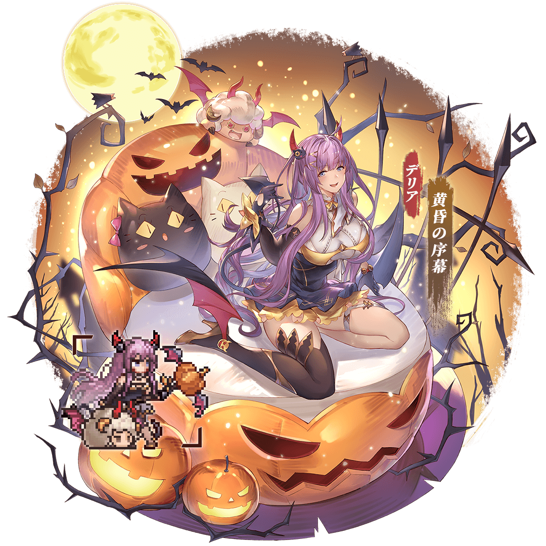無邪気でキュートなリリアンが、ゴーストと悪魔をモチーフにした装いで降臨。フリルとリボンが施された青と黒の衣装は、夜の闇に浮かぶ幻想的な光を思わせます。この狂乱の夜を、誰よりも楽しむ小さな悪魔との冒険を始めましょう。