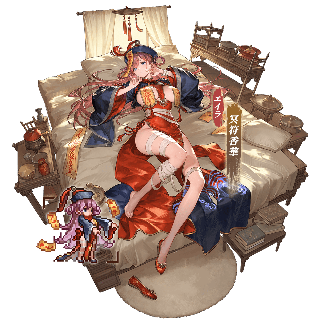 心優しき神使エイラが、東洋の神秘的な幽玄を纏い登場。 鮮烈な朱と藍のチャイナドレスを思わせる装束を、霊符と香華が彩ります。艶やかな衣装と、どこか物憂げな眼差しは、現世と幽世の境界線に佇むかのような儚い色香を感じさせます。