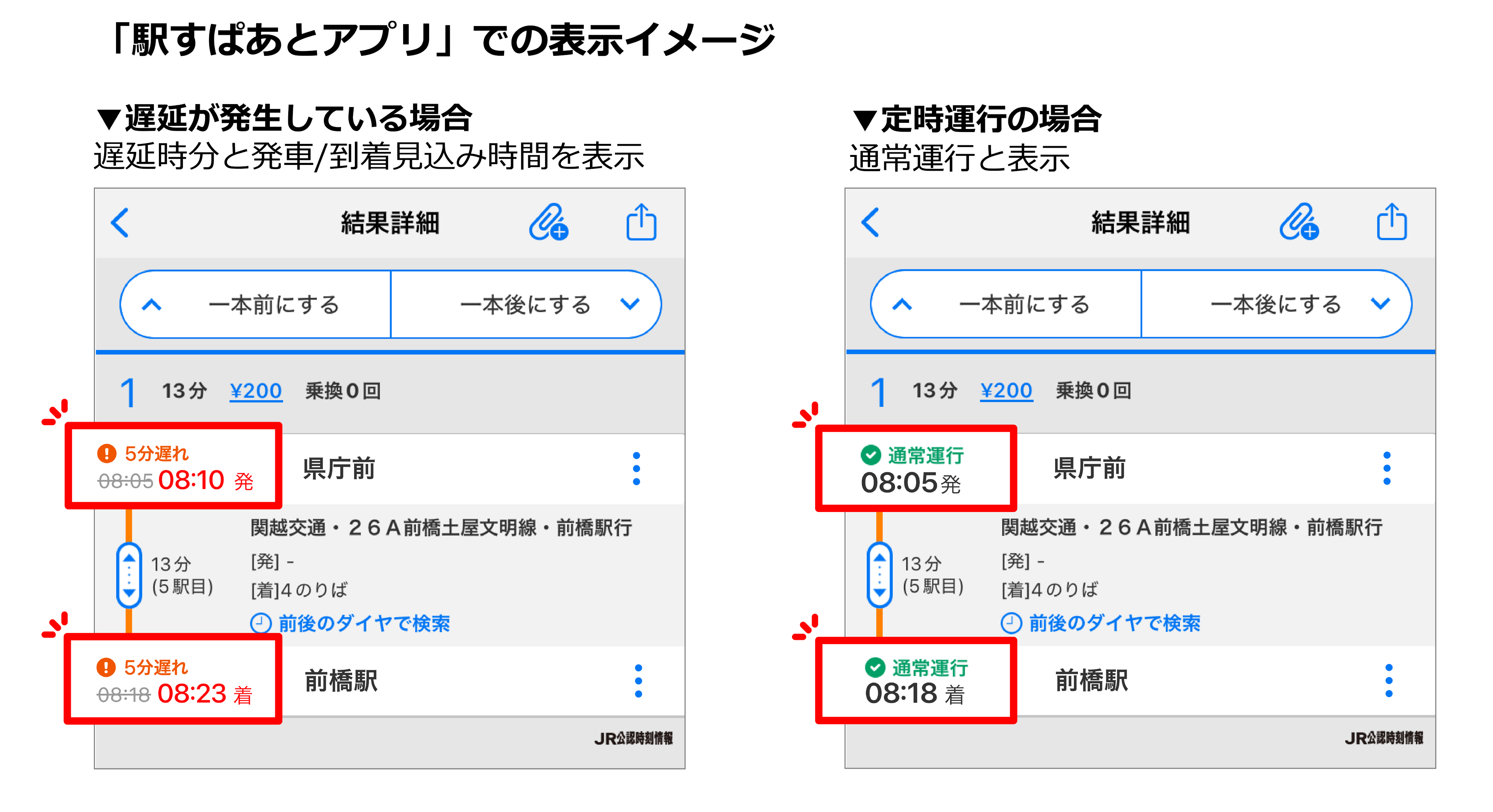 これまで当社では群馬版MaaS(Mobility as a Service)「GunMaaS(グンマース)」の取り組みに参画しており、群馬県内でのMaaSの普及および公共交通の利用促進にも尽力しています。そして今回、同県でのバスの利便性向上につなげる取り組みとして、「駅すぱあとアプリ」の経路検索結果および時刻表にて、群馬県内を走る路線バス(関越交通、群馬中央バス、群馬バス、上信観光バス、永井運輸、日本中央バス)のリアルタイムな遅延状況の表示を開始しました。
