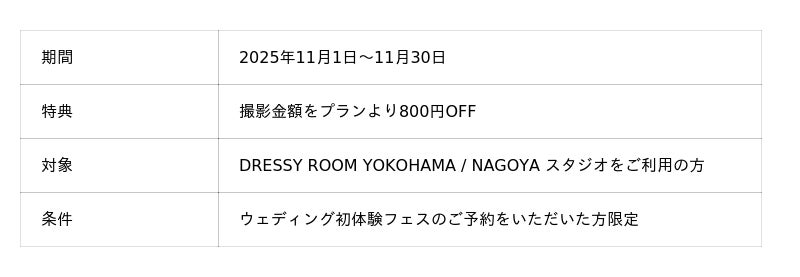セルフ写真館 PICmiiは、カメラ専門店「カメラのキタムラ」のグループ会社として、撮影画質の仕上がりにこだわったセルフ写真館で、個室での自由な撮影をお楽しみいただけます。DRESSY ROOM YOKOHAMA/NAGOYAスタジオでは『夫婦割キャペーン』を実施することが決定。11月22日はいい夫婦の日。11/1~11/30までにご夫婦またはカップルでご来店のうえ、ウェディング初体験フェスのご予約をいただいた方限定でご利用料金より800円OFFとさせていただきます。※ご予約時・ご来店時に「キャンペーンの記事を見た」とお伝えください。