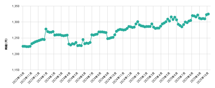 ■10月度の全国アルバイト・パート平均時給は、1,325円(前月比+13円、前年同月比+54円)で前月から0.99%増加、前年同月から4.25%増加した。【図1】