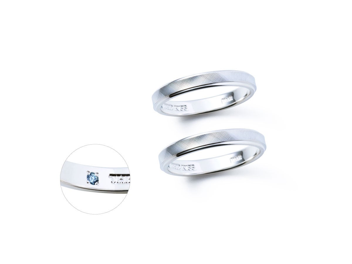 「幸せで満ちあふれますように」との願いを込め、リング内側にはブルーのラボグロウンダイヤモンドをセット。まるでふたりの幸せを見守ってくれているよう。