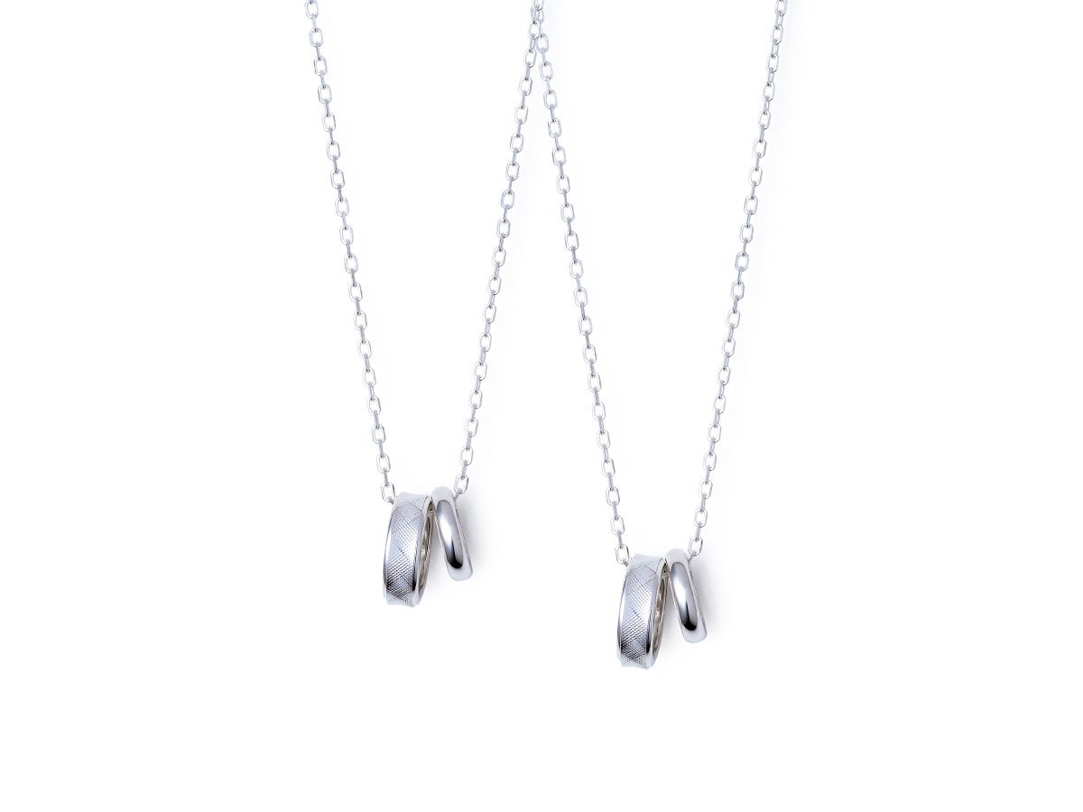 全体に繊細なカットを施したリングが印象的なペアネックレス。