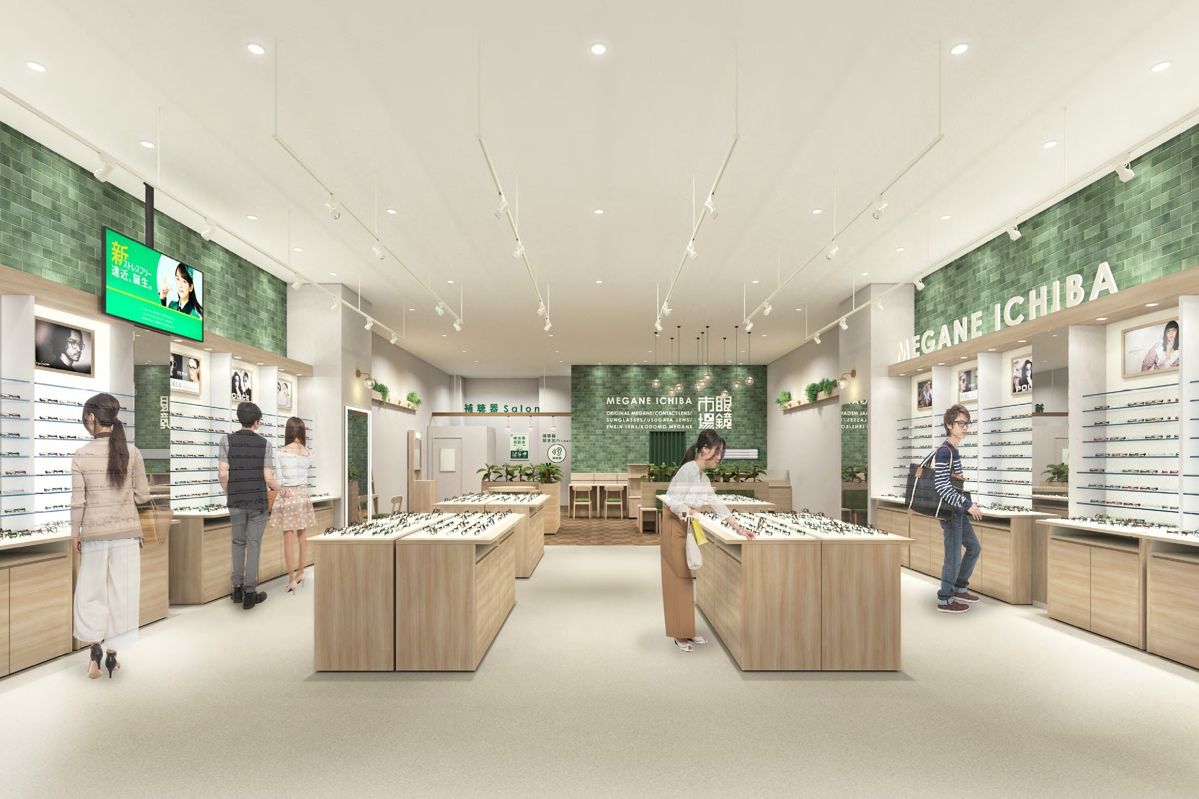 ベビーカーや小さなお子さまと手を繋いでのお買い物を想定し設計した通路や、お連れさまの視力測定や混雑時でもゆっくりできる待合スペースなど、様々な世代のお客さまが安心してメガネ選びを楽しむことができる空間にしました。また、メガネの展示、待合・各種診断、補聴器サロンと目的毎にスペースを明確に分けているため、各体験に集中でき、居心地の良い空間を目指しました。