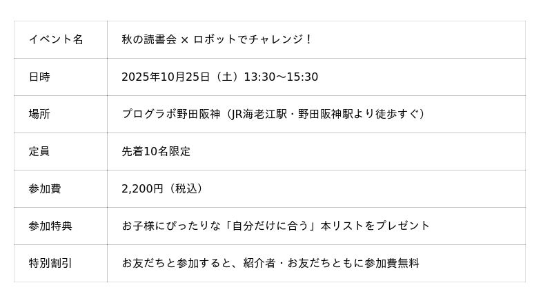 考える力を身につける全科目先取り個別学習塾「ミライ式」(運営会社:株式会社TricoLogic)は、夢を実現するチカラを育む子ども向けロボットプログラミング教室「プログラボ」(運営会社:株式会社ミマモルメ、阪急阪神ホールディングスと読売テレビが協同で運営)と【秋の読書会×ロボットでチャレンジ】イベントを2025年10月25日(土)に開催します。