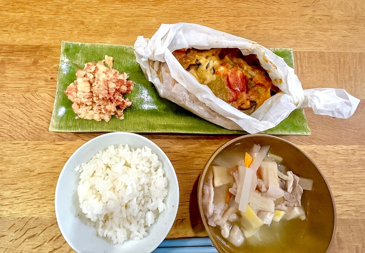 鮭と彩り野菜のホイル焼き ~味噌ヨーグルトソース~