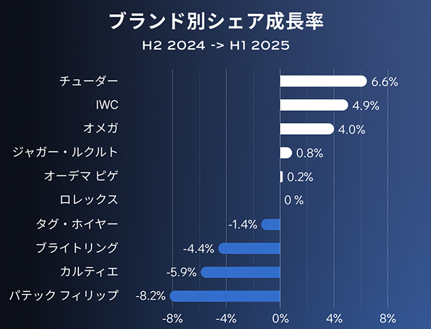 主要なトレンドにとどまらず、二次流通市場は引き続き堅調に推移しています。オメガは、2024年下半期から市場シェアを4%伸ばし、11.3%で第2位となりました。熱心なファンの根強い支持を基盤とした、堅調なパフォーマンスを反映しています。チューダーとIWCは、魅力的なラインアップと顧客層の拡大によって、前年の下半期からそれぞれ6.8%と4.8%増と最も好調な伸びを記録しました。ハイエンドブランドでは、パテック フィリップとオーデマ ピゲが、コロナ禍の投機を目的とした需要のピークを経て、現在では時計愛好家の間で、安定した価格で取引されています。