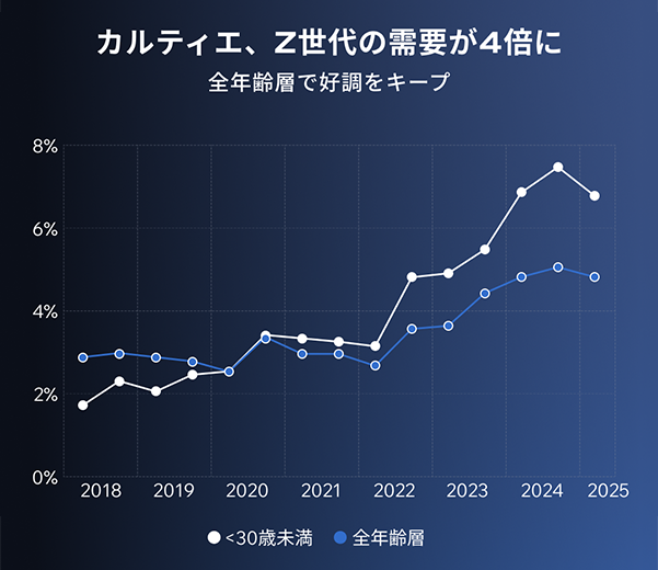 - Z世代とカルティエ:Z世代におけるカルティエのシェアは、7年間で1.7%から6.8%へと4倍に増加。カルティエの市場全体のパフォーマンス(2.9%から4.8%)を大きく上回る結果に。