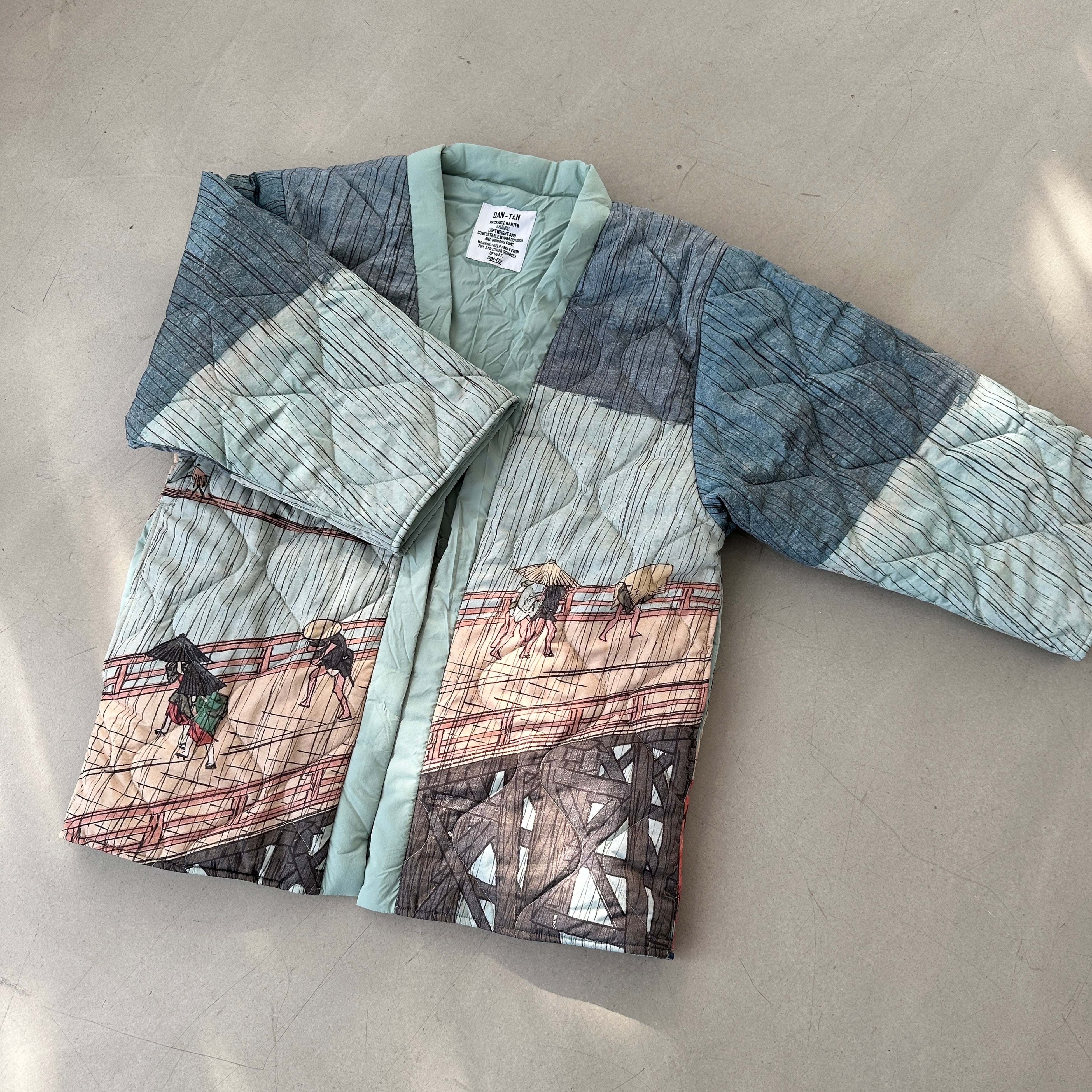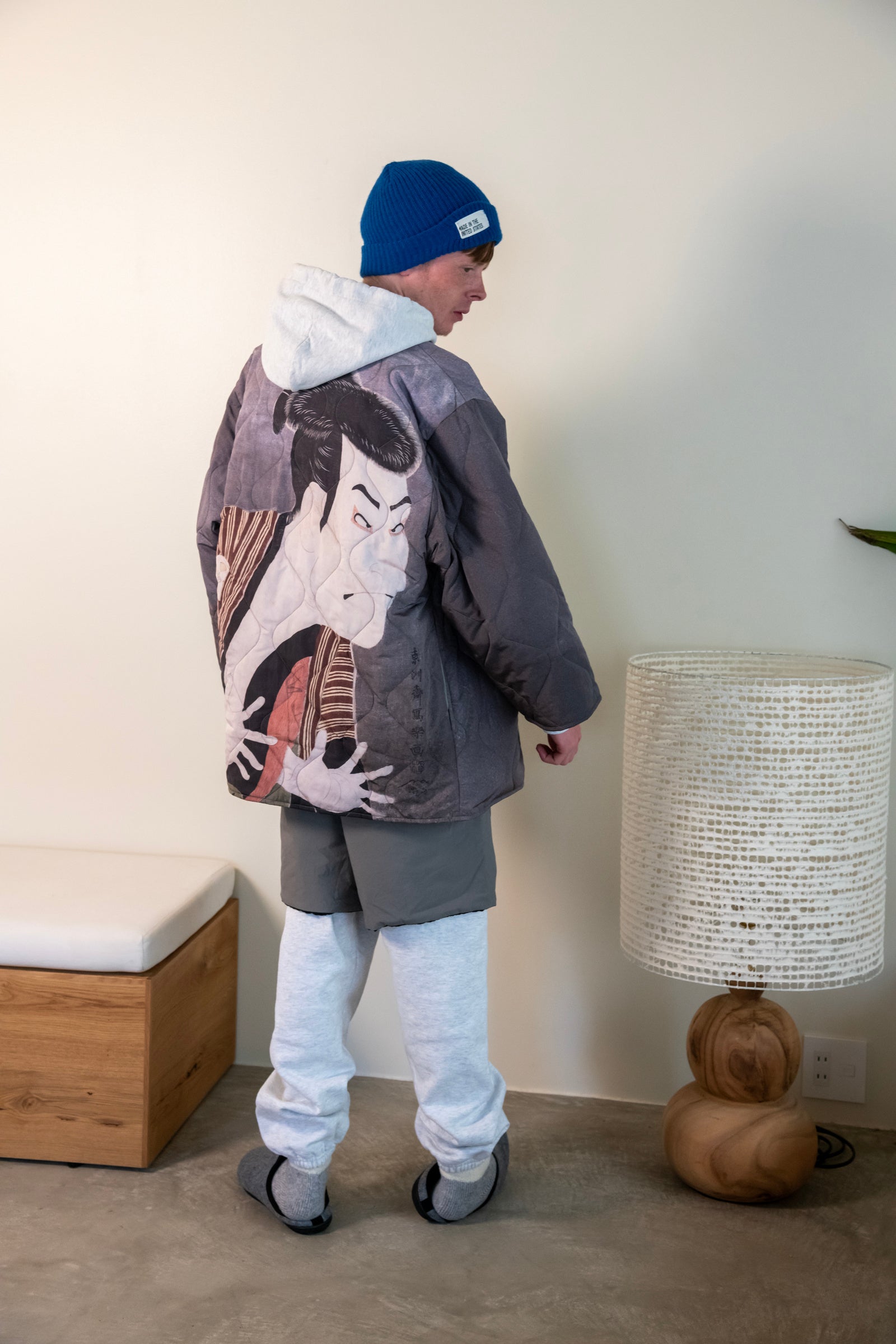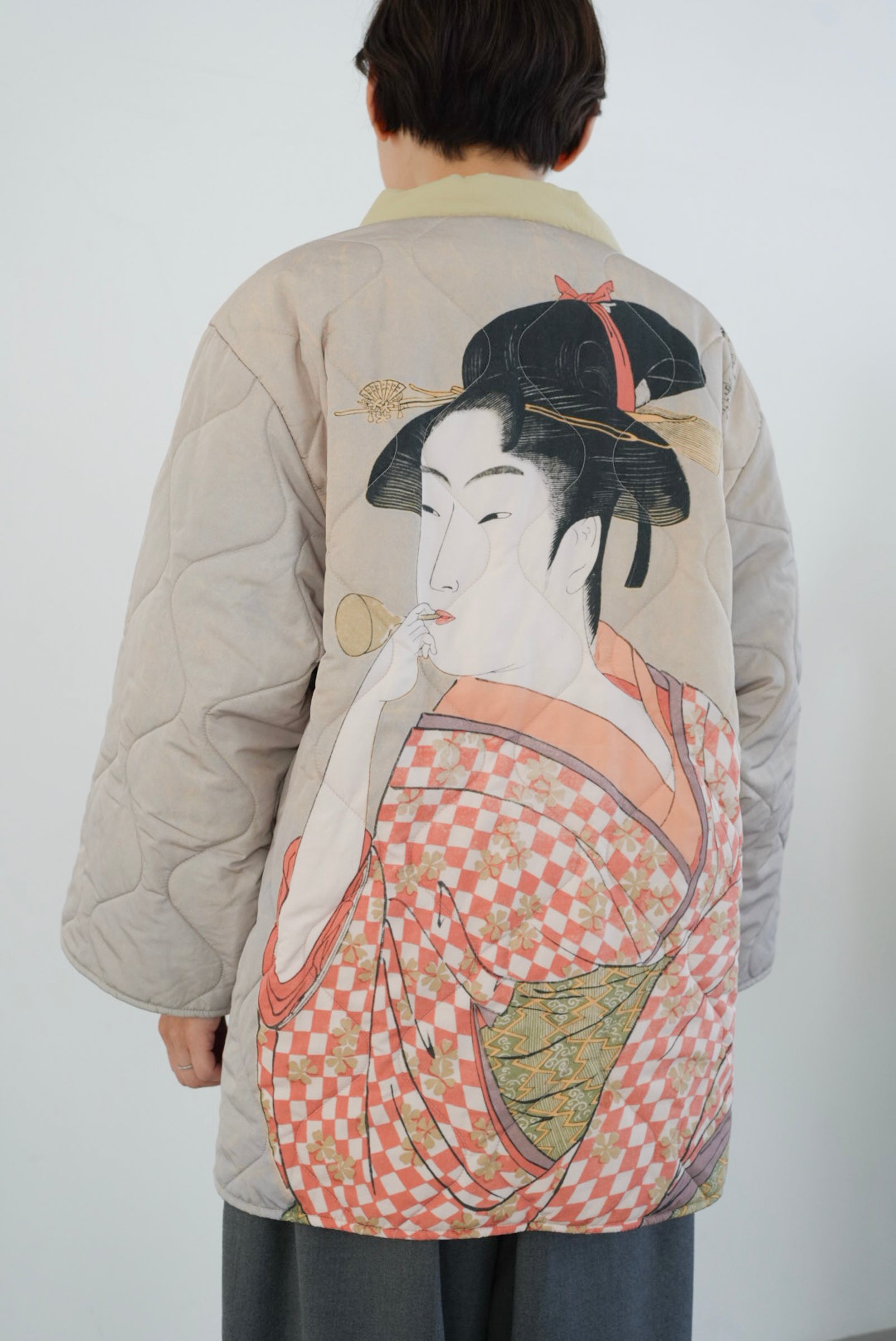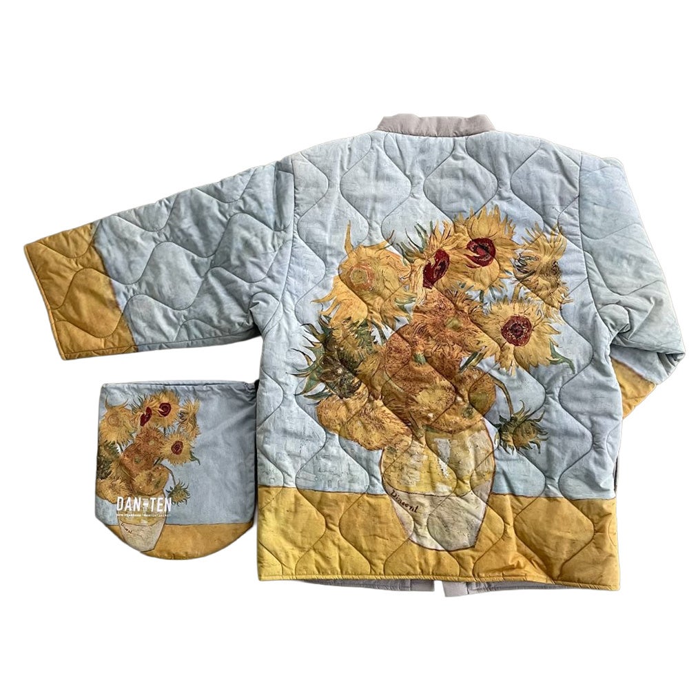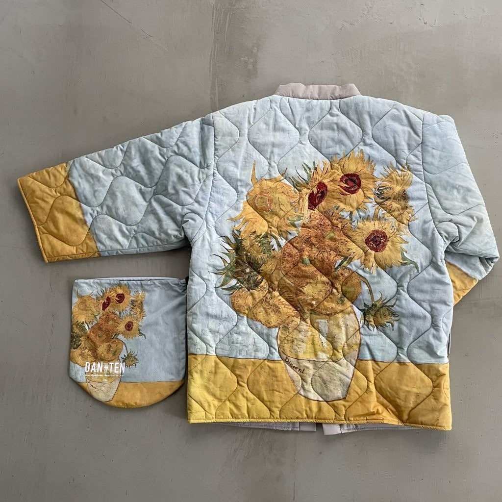 昔ながらのはんてんを軽量化し、より体に沿うようパターンをアレンジしたDAN-TENシリーズの定番型「DAN-TENコンフリーシリーズ」の表面に全8種類の名画をプリントした大胆なデザイン。