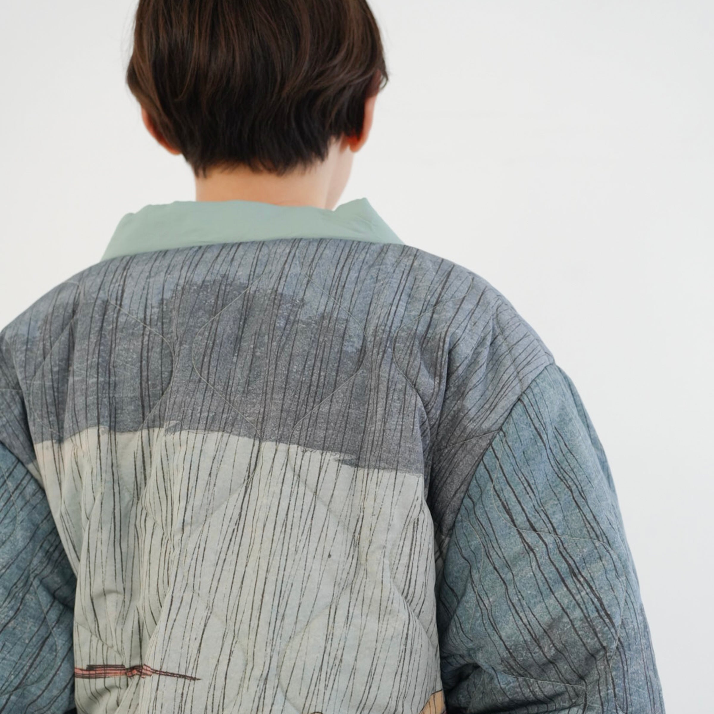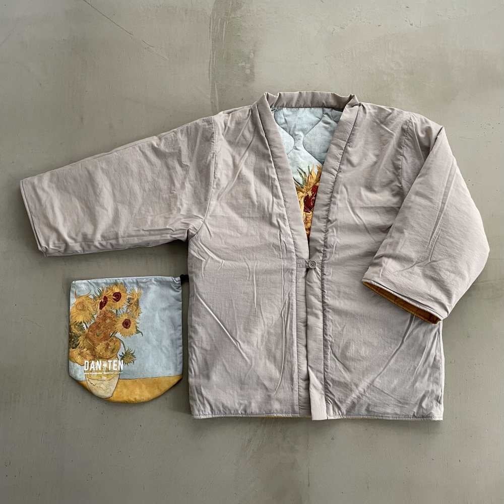 DAN-TENミュージアムシリーズは全柄リバーシブルで着用可能。無地面にはキルティングを施していないため、よりすっきりとしたスタイルに。部屋着としてだけでなく、ちょっとそこまでさっと羽織って外にも出られるスタイルを提案しています。