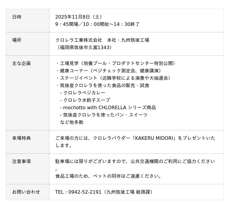 お近くの方、「筑後産クロレラ」にご興味のある方、ぜひこの機会に九州筑後工場にお立ち寄りいただき、クロレラ・ふれあい祭りをお楽しみください。