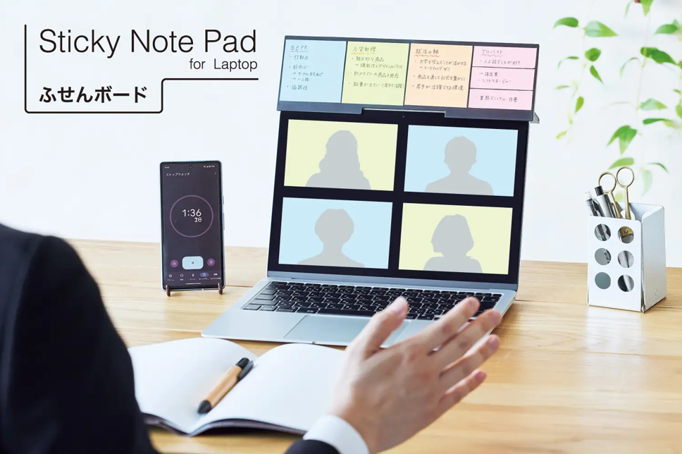 WEB会議や配信に!目線を下げずにカンペが見られる!ノートPC用『ふせんボード』近年、オンライン会議サービスの普及によって、オンラインで面接や会議を行う企業が増加しています。その際の困りごととして、手元の資料やノートを見る時に目線が下がることが挙げられます。そこで、ふせんを貼り付けてカメラ目線のまま要点をチェックできる『ふせんボード』