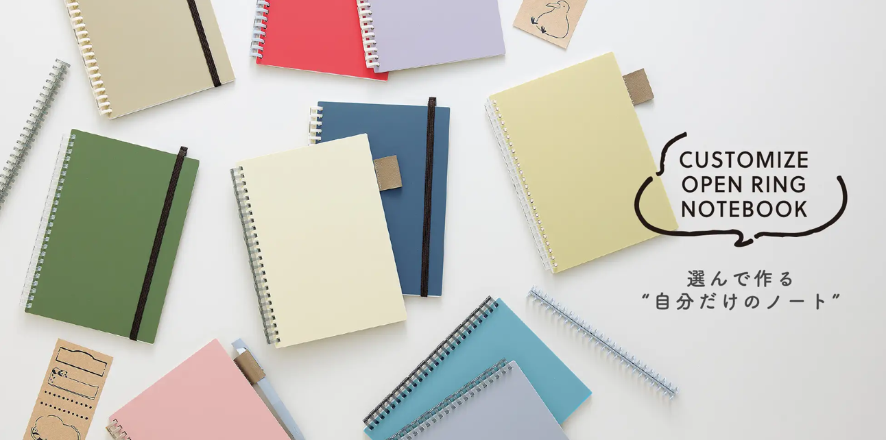 390通り以上の組み合わせから、オリジナルノートを作れる 『カスタマイズオープンリングノート』お好みの色の表紙やとじ具、使いやすいリーフなど、好きなパーツを選んで"自分だけのノート"を作ることが出来ます。開くとじ具を活かし、お好みの色の表紙やとじ具、使いやすいリーフなど、390 通り(表紙ととじ具の組み合わせの場合)以上の組み合わせの中から好きなパーツを選んで、自分でオリジナル のノートを作ることが出来るシリーズ。